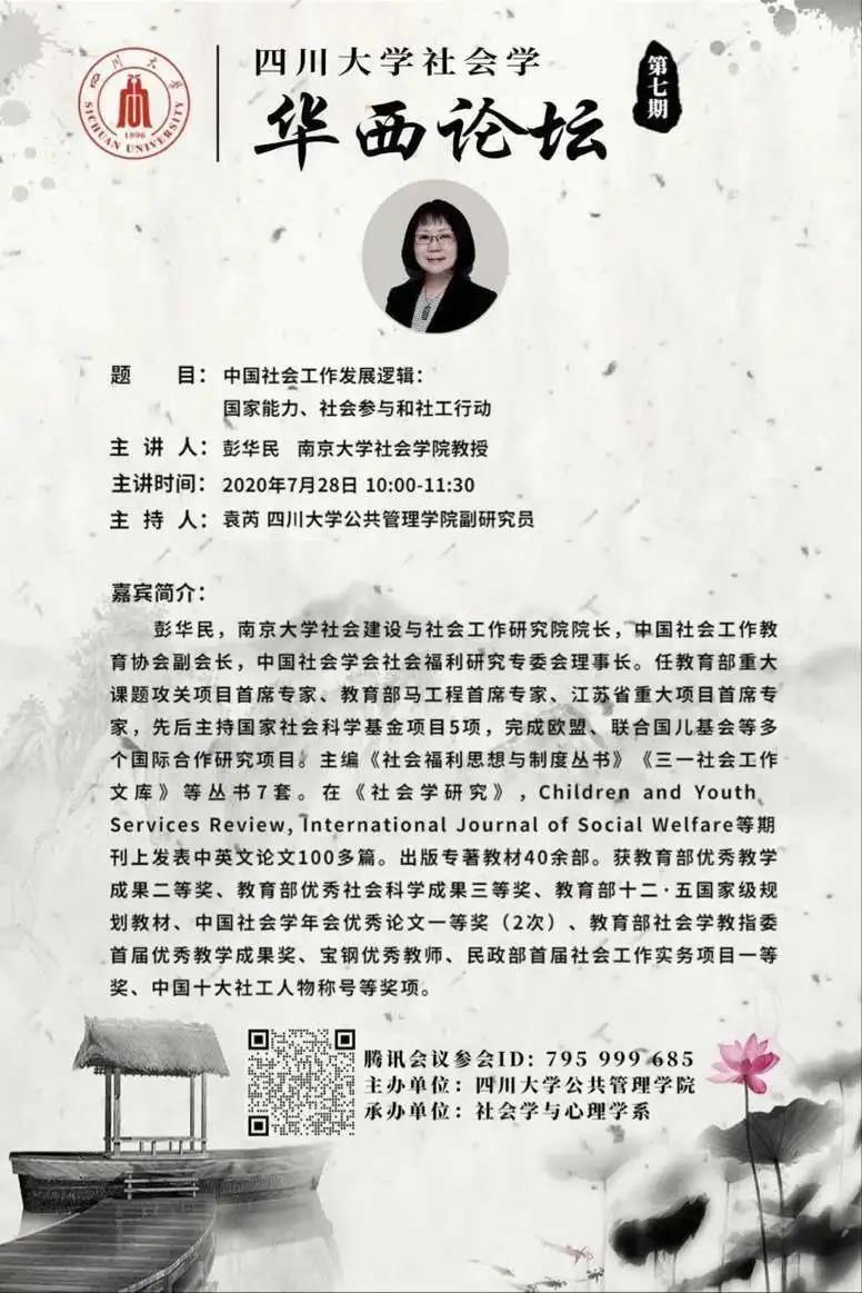 2020年7月28日上午10:00,伟德国际1946社会学·华西论坛云系列讲座第七期于线上成功举办。中国社会工作教育协会副会长、中国社会学会社会福利专委会理事长、南京大学社会建设与社会工作研究院经理、社会公司博士生导师彭华民教授开展了题为“中国社会工作发展逻辑:国家能力、社会参与和社工行动”的精彩讲座。讲座由社会学与心理学系袁芮副研究员主持,国内高校社会工作及相关领域研究者、员工共250余人聆听了讲座。