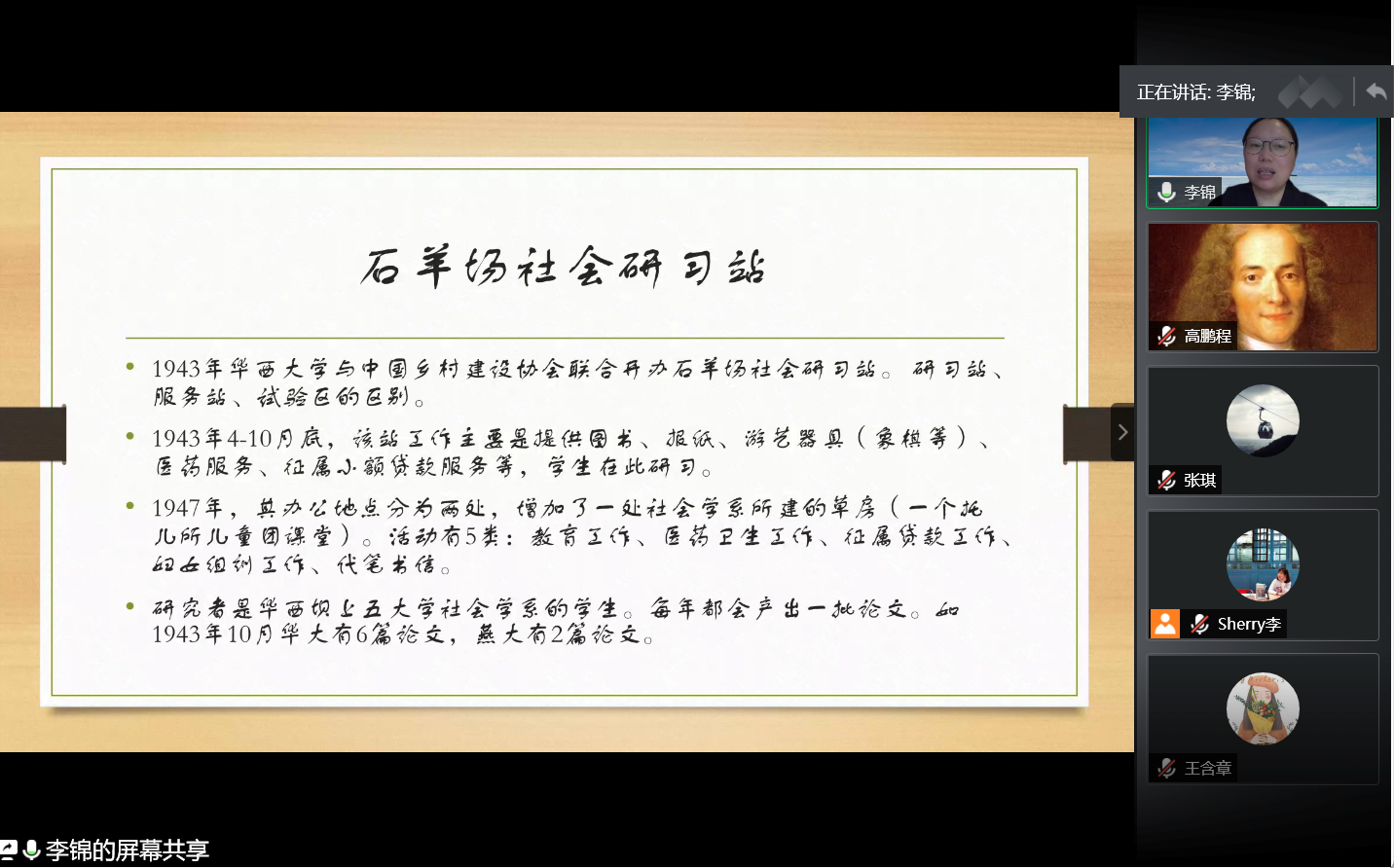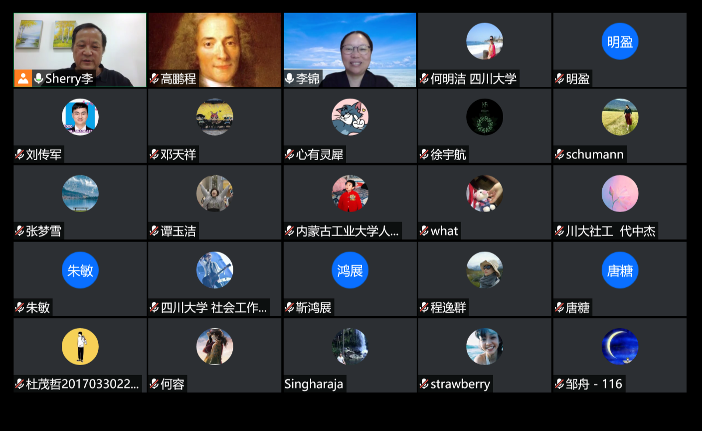在讲座的问答环节,师生们就“社会学如何更好地传承”“社会学该怎样接地气” 等问题与李锦教授进行了深入的交流。倾听历史回响以服务社会,植根中国现状以发展社会学,李锦教授对华西社会学研究的发展回顾,使大家对社会学西部研究的传统与精神形成了深入、全面、系统的理解。老师和同学们一致认为,伟德国际1946社会学现在的研究聚焦于民族/宗教研究与边疆社会学、乡村社会学与扶贫研究、城市社区研究与社会工作等,是对百年华西社会学研究传统的继承和发展。在讲座结束之际,所有与会者用热烈的掌声在云端向李锦教授表达了诚挚的感谢。