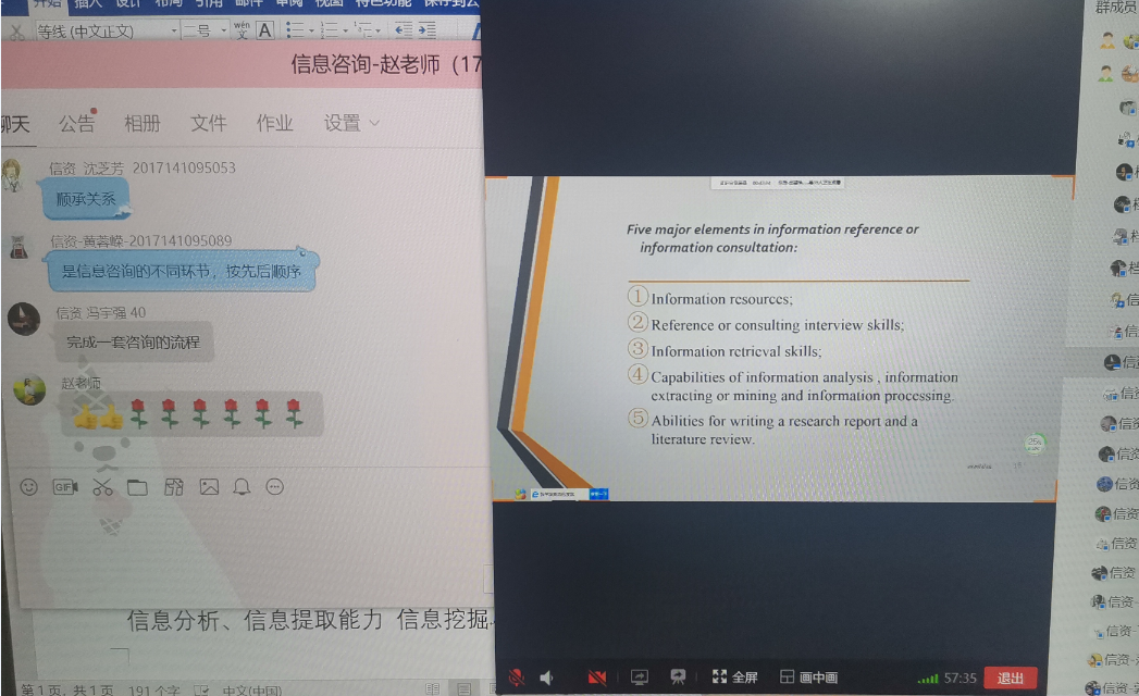 从任课教师反馈来看,《信息咨询》任课教师赵媛教授谈道“第一次的网课整体感觉不错,员工都准时上线、QQ视频和语音清晰流畅,员工互动情况非常好,取得了一些意想不到的效果”,她还进一步指出,线上教学有多方面的优点:一是同学们在课堂互动中不好用语音表达的可以转为文字表达,这样既利于同学克服紧张情绪,又利于全体同学查看和师生立即点评回复,触发激烈讨论;二是可以用表情包缓解和活跃课堂氛围,拉近和员工距离;三是网上教学方便员工随时上网查资料、回答问题和参与互动讨论。同时,她也指出网上教学也有和员工不能做直观的交流、无法实时监督员工学习状态等不足。