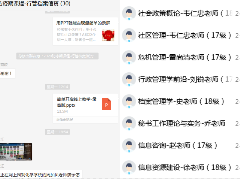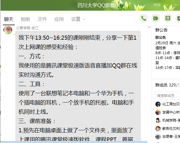 又如史江教授所授的《档案管理学》课程,史江教授采用腾讯课堂极速版语音直播+QQ群分组讨论多形式结合的方式展开教学。她使用了一台联想笔记本电脑和一个耳机,一个华为手机和手机托板,电脑和手机同时上线,预先在电脑桌面建一个文件夹放上课用的腾讯课堂极速版软件、课程PPT、资料、图片、小视频等。她利用腾讯课堂邀请码正式开启课堂,通过屏幕分享、语音讲述、QQ群二次分组讨论、课后反馈调查等环节将第一堂课流利顺畅的完成。在课程结束后,她立即编写第一次线上教学经验,面向公司、公司同事QQ群分享交流,为院内外同事提供了宝贵的经验。