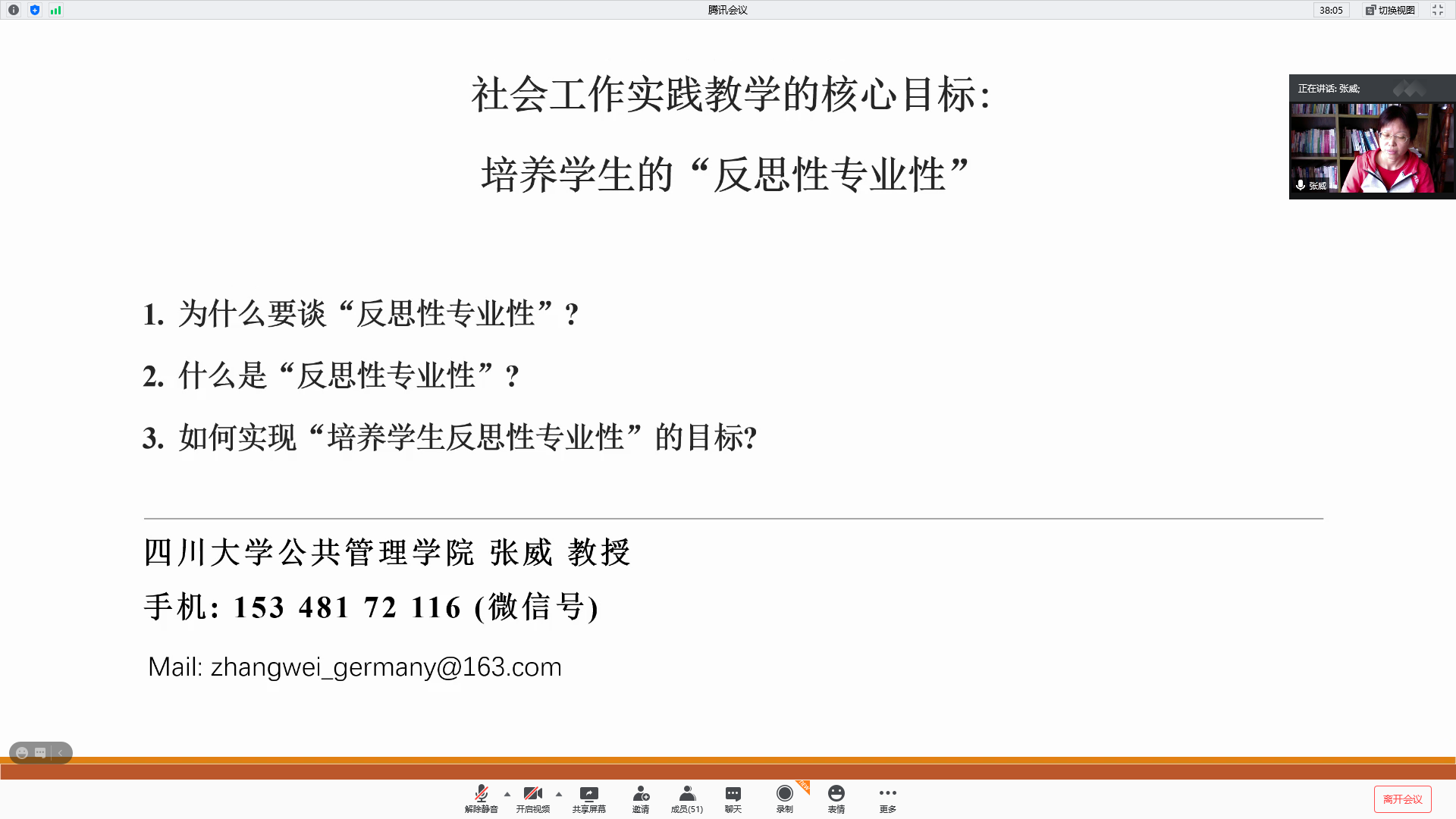 2020年9月26日公司社会学与心理学系张威教授受中国社会工作教育协会邀请参加“中国社会工作实验教学研讨会”并做主题发言。本次研讨会由中国社会工作教育协会社会工作实验教学专业委员会主办。张威教授的发言题目为:社会工作实践教学的核心目标:培养员工的“反思性专业性”。