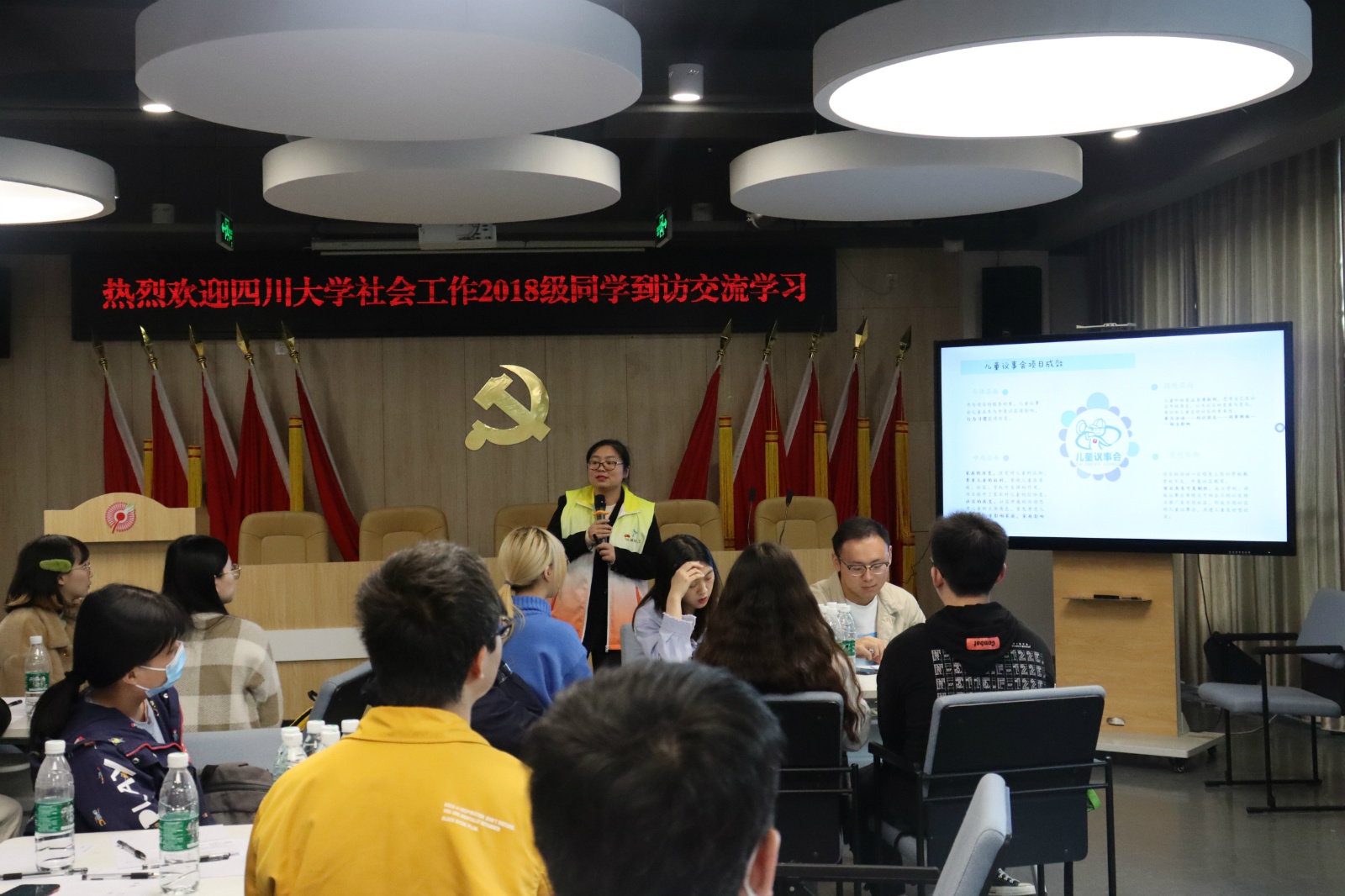 在多功能会议厅,社工重点从奎星楼社区的“抗逆力小童星”和“儿童议事会”两个项目出发,向师生展示了近年来社区开展的针对儿童青少年的特色社会工作服务。抗逆力是在儿童成长过程中极易受忽视的能力,社工根据社区具体情况,从理念培养、实践养成等方面给予孩子们具有针对性的训练。项目通过为期五天的夏令营式活动将减压教育、感知教育等内容有机融入活动,在培养儿童健康心态和提升抗逆力方面产生了显著效果。