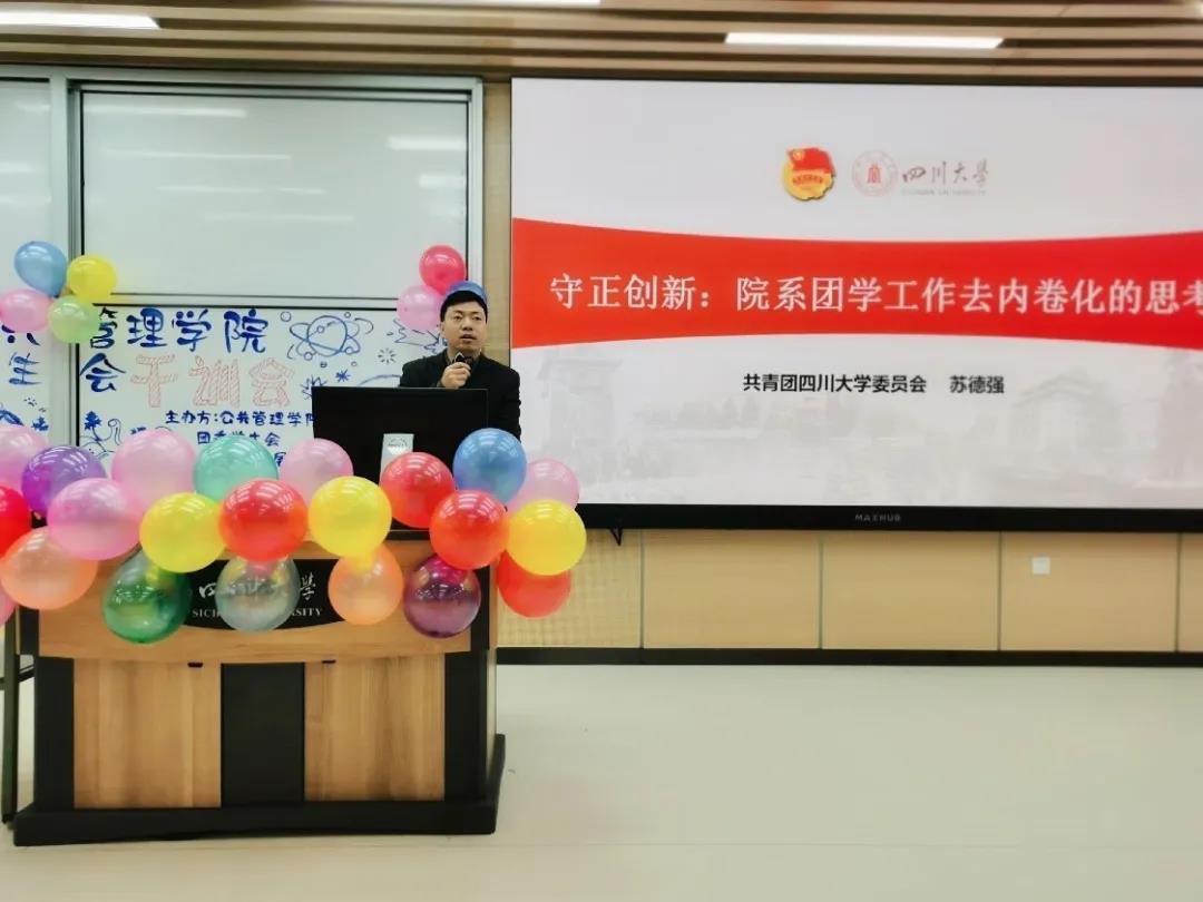 首先,苏德强老师以“守正创新:院系团学工作去内卷化的思考”为题为大家带来指导。苏老师指出了院系团学工作中存在的值得注意的倾向、阐释了“内卷”的概念与特点、点明了院系团学工作内卷化的典型特征,让全体参会人员对院系员工工作去内卷化有了更深的认识。苏老师在对伟德国际1946团学工作给予充分肯定的同时,激励全体成员在今后的员工工作中能更好的引领服务、锻炼自我,发扬公司特色,将公司团学工作推向更高的台阶。