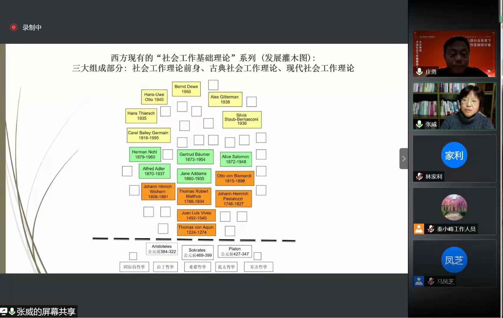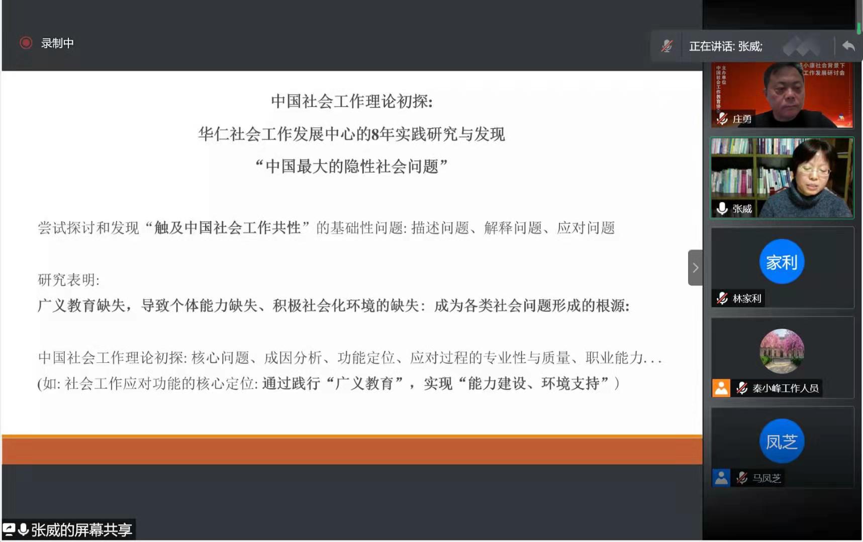 因疫情原因,中国社会工作教育协会2020年会于12月26日线上进行,张威教授参会并做大会发言“构建中国社会工作理论的三重反思”。张威教授与社会工作有着25年的渊源:她在德国和中国“教社会工作20年”、“做社会工作8年”(创立成都华仁社会工作发展中心、亲自为百姓提供社会工作咨询)、“研究社会工作基础理论10年”、“研究华仁实践8年”。