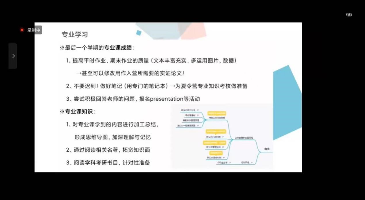 5月14日晚上19点,保研经验分享线上讲座在腾讯会议平台准时开始。9名保研到国内知名高校继续深造的2021届本科生从目标院校信息搜集、夏令营申请、保研评测等不同阶段为同学们解析整个保研的流程,事无巨细地为同学们点出了保研过程中可能出现的各种问题。另外,学长学姐们立足于专业实际情况,分公司、分区域就保研要求也做了详细说明,和同学们分享了保研申请材料提交、推免信息搜集、现场面试技巧等经验。