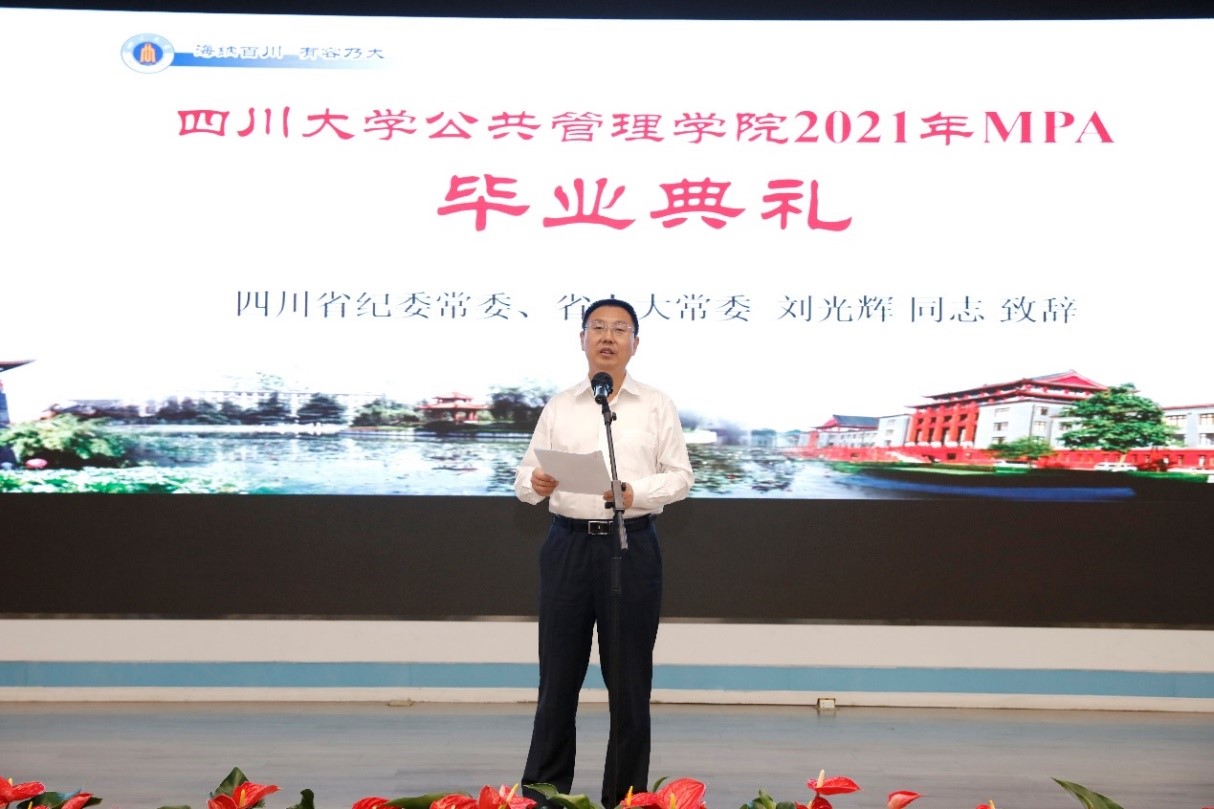 四川省纪委常委、省人大常委刘光辉同志代表四川省纪委监委向圆满完成学业的全体同学表示衷心的祝贺,以自己的人生体会寄语即将远行的同学。一是保持一学到底的韧劲,做到学以致用,知行合一;二是保持一往无前的担当,敢于较真碰硬、履职负责、担当尽责;三是保持一身正气的品质,强化天下情怀、家国情怀、人民情怀和担当意识,处理好“公与私”、“利与益”,时常省己、择己、修己、克己。这既是对MPA纪检监察班毕业生的衷心祝福,也是对他们的殷殷期盼,祝愿同学们在新的人生里程中一帆风顺、鹏程万里。