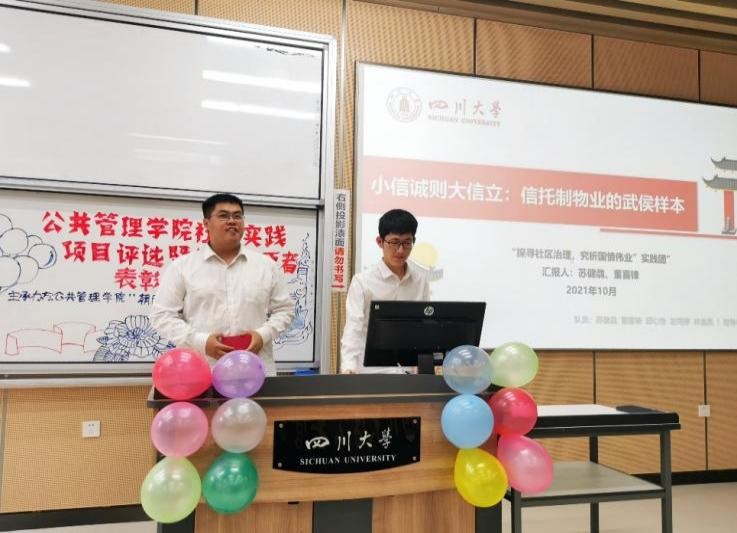 在激烈的社会实践项目评选过程中,公司艺术团的赛泠然同学还专门献唱了一首歌曲《敬你》,平缓、优美的韵律让答辩同学们所有紧张的情绪得以疏解,也获得了精神鼓舞。随着最后一支队伍川行队展示结束,整个评选走向了尾声。经过量化打分综合评审,“探寻社区治理,究析国情伟业”实践团获得了一等奖,浙阿连心队、渝行队获得了二等奖,陇上行小队、心之所向队、好年华聚福州队获得了三等奖,浙里下乡队、山与江与川与渝队、“三线建设”研究队、川行队获得了优秀奖,评委老师对获奖的社会实践队伍颁发了奖状与礼品,并与他们合影留念,本次大会到此圆满结束。