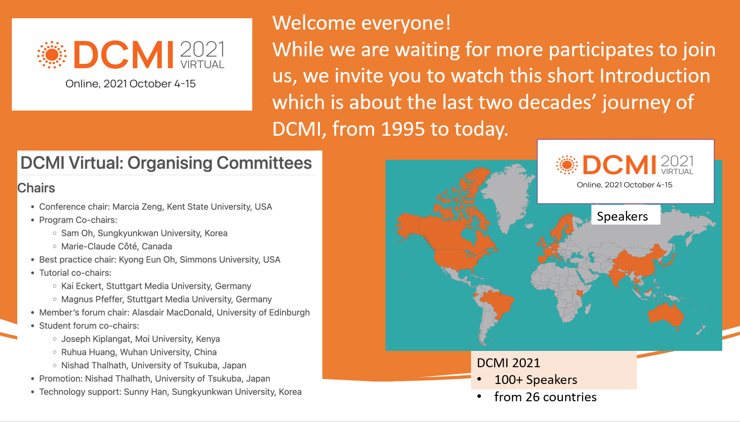 2021年10月4日至10月15日,由都柏林核心元数据倡议DCMI组织举办的国际会议DCMI 2021 Virtual在线举行。DCMI在互联网发展初期提出了信息资源描述的通用元数据标准DC,也是如今ISO 15836的制定者。自1995年起,DCMI每年举办国际元数据会议,讨论元数据发展,汇聚展示元数据实践应用成果,业已成为元数据领域覆盖面最广的权威专业会议之一。2021年会主题是“元数据创新”,历时12天,来自全球26个国家的专家学者,100余位汇报者在线展开交流与讨论。此次会议内容丰富,包括主旨报告、专题研讨会、最佳实践会议、专家小组讨论、特邀讲座、培训讲座以及员工论坛等。