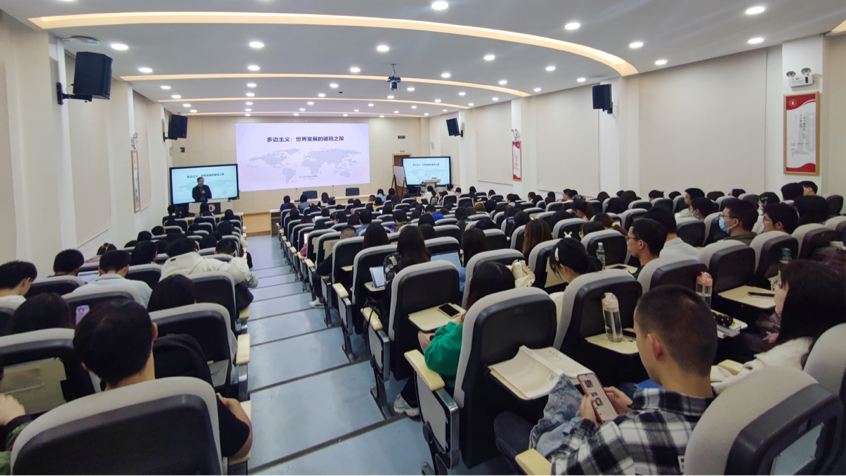 接着,杨磊老师从“时代面临的四大课题”、“多边主义的历史演进”、“多边主义为什么好”“践行多边主义的中国行动”四个方面展开深入讲解。在时代面临的四大课题方面,世界呈现出经济复苏势头不稳、意识形态偏见仍存、发展鸿沟有待弥合和全球性挑战日益上升等主要挑战。在多边主义的历史演进方面,杨磊老师从纵向上回顾了这一概念的缘起、发展与现状。
