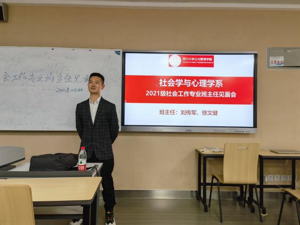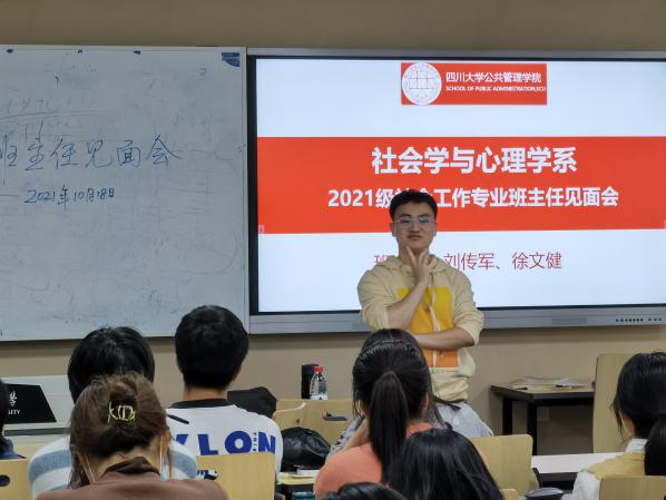 为了帮助同学们更好地了解社会学与心理学系全体教师的教学科研情况,促进专业教师与员工之间的交流互动,助力学业发展,2021级社会工作专业于10月19日晚在江安校区第一教学楼D506顺利开展了班主任见面会。会议由徐文健、刘传军两位班主任老师主持,2021级社会工作专业全班同学参加。