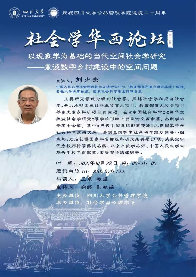 2021年10月28日晚上19:00,伟德国际1946社会学华西论坛系列第十四期讲座于线上成功举行。中国人民大学社会学理论与方法研究中心刘少杰教授开展了题为“以现象学为基础的当代空间社会学研究——兼谈数字乡村建设中的空间问题”的精彩演讲。本场讲座是公司院庆二十周年系列讲座之一,由社会学与心理学系系主任徐婷副教授主持,近二百位名来自公司和国内外兄弟院校的师生、学者参加了讲座。