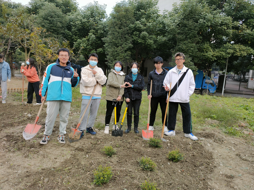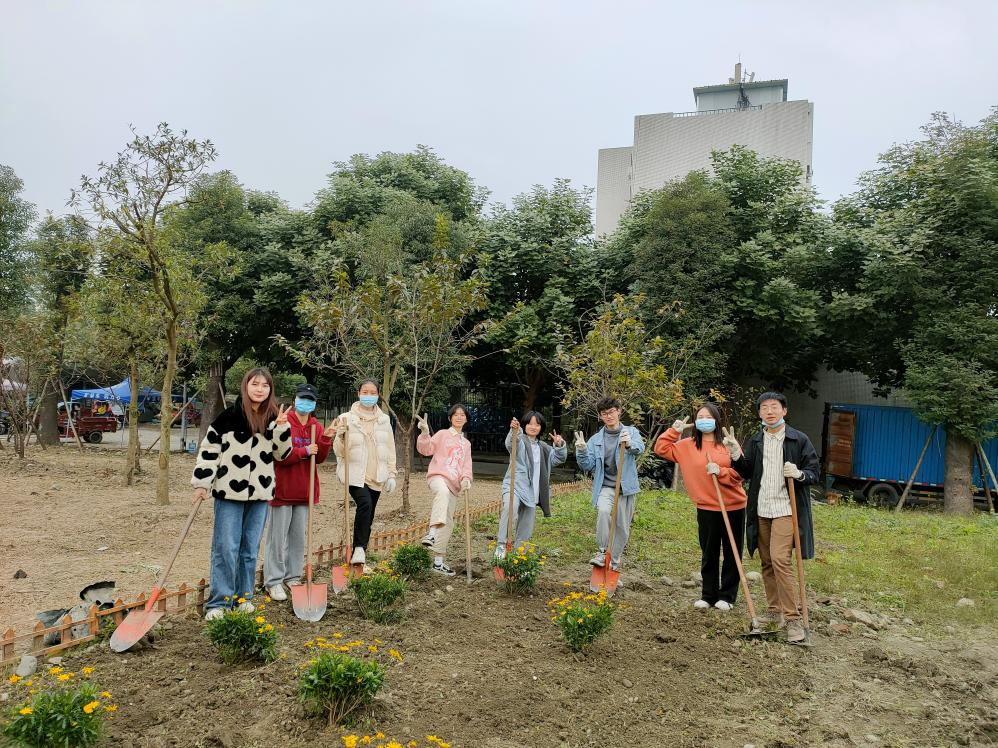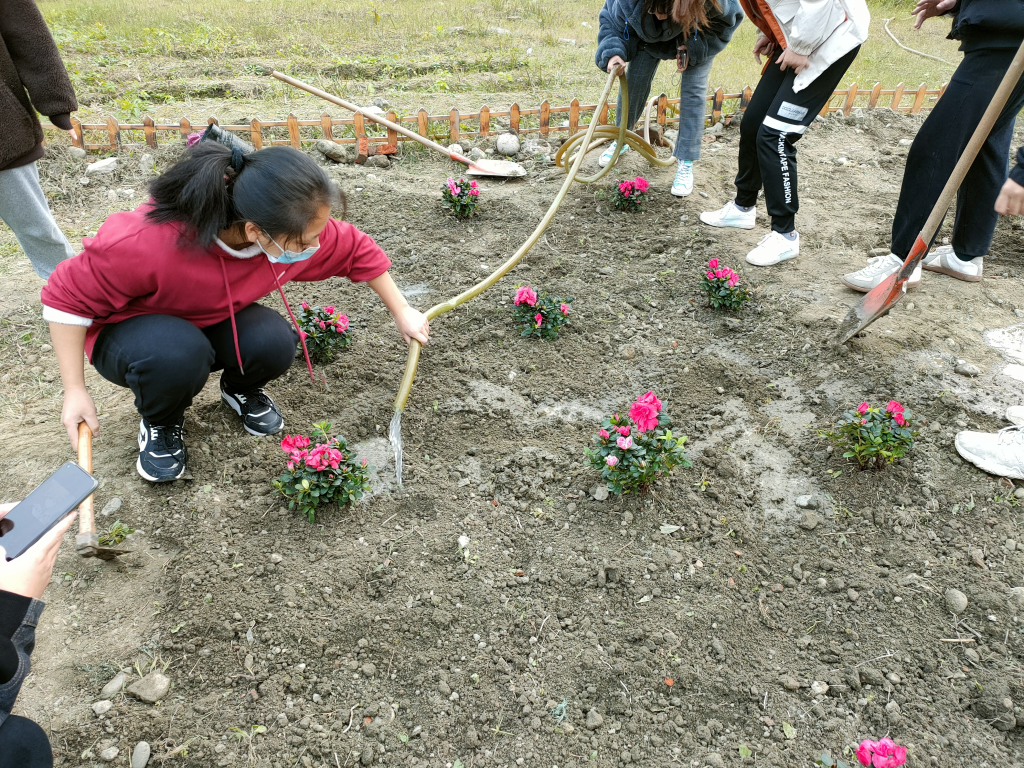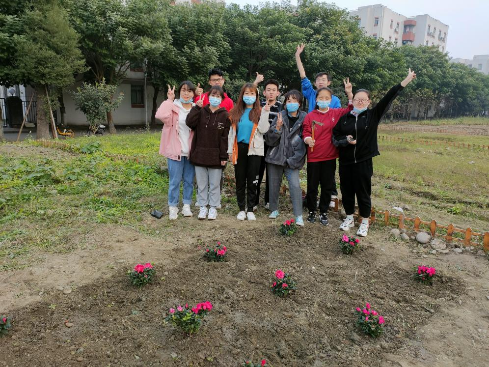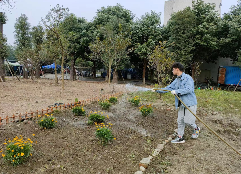 经过了前一日的除草耕地,原本荒芜的土地也变得可人了许多。由于13日下午同学们已提前将买好的满天星、杜鹃、木春菊植株搬到“开心农场”,14日下午3:30同学们到达农场后便迅速开始了植株种植。“慢工出细活”,同学们用铁锹细心刨出一个个小土坑,小心翼翼地将植株放进去,用土盖好,再用铁锹将土拍紧,最后用水管给植株浇水。下午5:00左右,一株株花儿就都种好了,原本荒芜的农场在大家的共同努力与精心装扮下变成了美丽的小花园,也成为伟德国际1946江安校区一处靓丽的风景。
