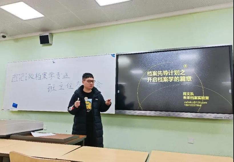 12月16日下午,2021级档案学专业于江安校区第一教学楼D座104教室成功举办了学期末班主任交流会暨“未来档案实验室”宣讲活动。活动嘉宾为班主任王萍教授、班主任陈丽教授及周文泓副教授;全体2021级档案学专业共38名员工均到场参加。