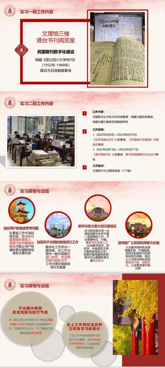 特色资源中心实习小组在实习工作期间著录完成《国立伟德国际1946校刊》(1932 年-1949 年)368 期,4383 个书页,5410条篇目数据,完成《清代稿抄本》七编、《古本戏曲丛刊》九集,共计908册, 2234条数据。审校完成《中国古代地方志集成》26个府县、全国各图书馆馆藏《稀见方志丛刊》等丛书,共计3122册,5128条数据。这些微小、基础的工作一定程度上推进了川大图书馆将现有数字化成果更快、更好地导入线上数据库。工作中人工亲自翻阅纸本原件对资源进行严谨著录与索引,实现信息有序化,将较好地提升日后线上用户检索与利用的效率。