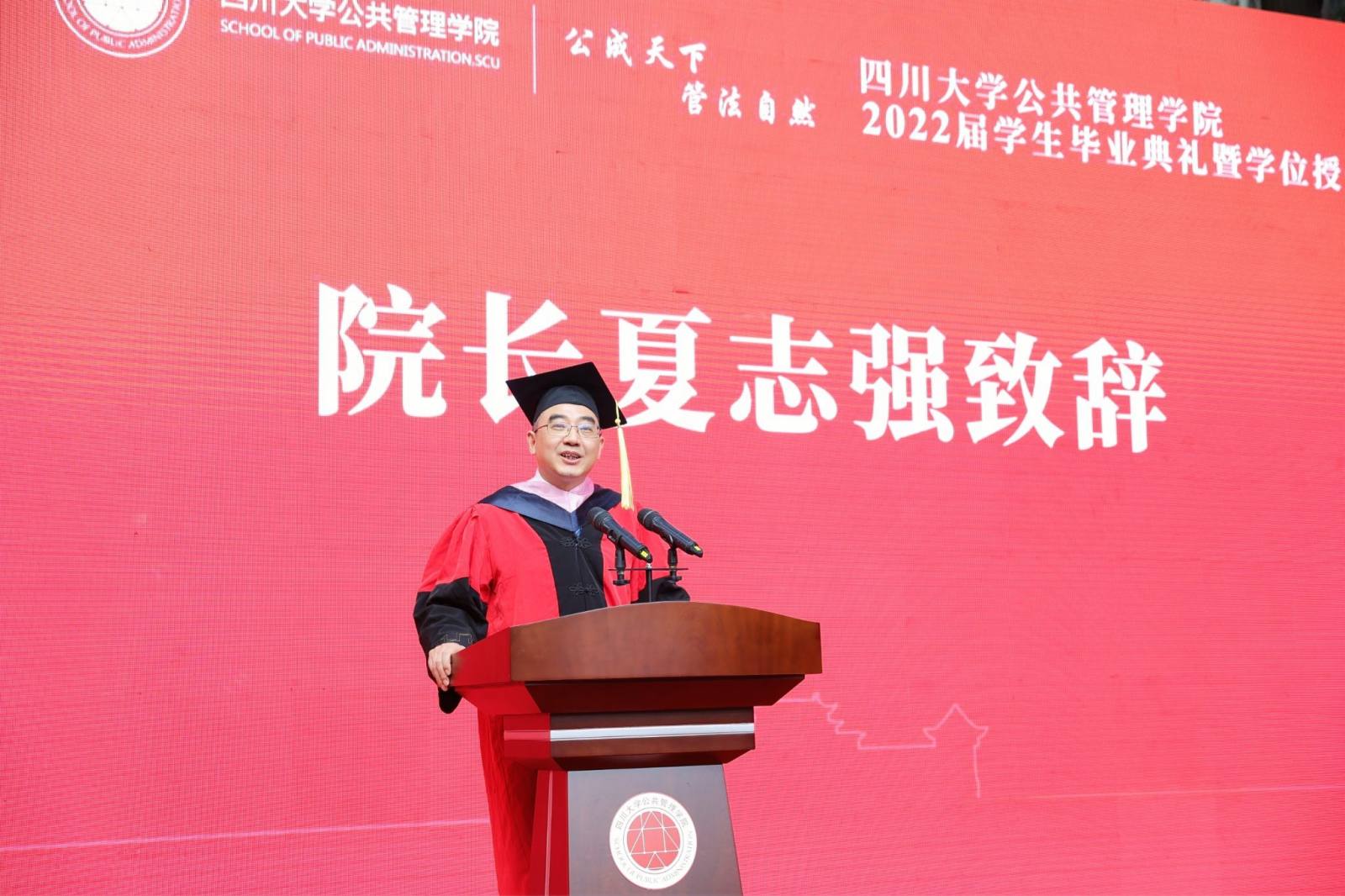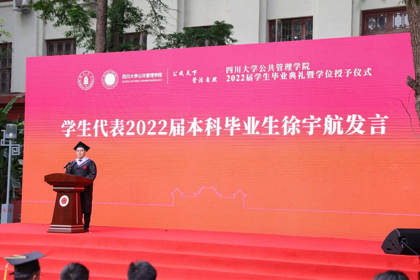 员工代表2022届本科毕业生徐宇航同学在发言中感恩公司的培养、老师的教诲、同学的陪伴,表示将记住老师们的嘱咐,并将“公成天下,管法自然”的院训撒播四方。员工代表、中共成都市委办公厅会议处处长、2013届MPA毕业生邓冰梅在发言中祝贺学弟学妹们顺利毕业,并以自己的成长经历鼓励学弟学妹在奔往人生新征程中不怕苦累、勇敢前行。