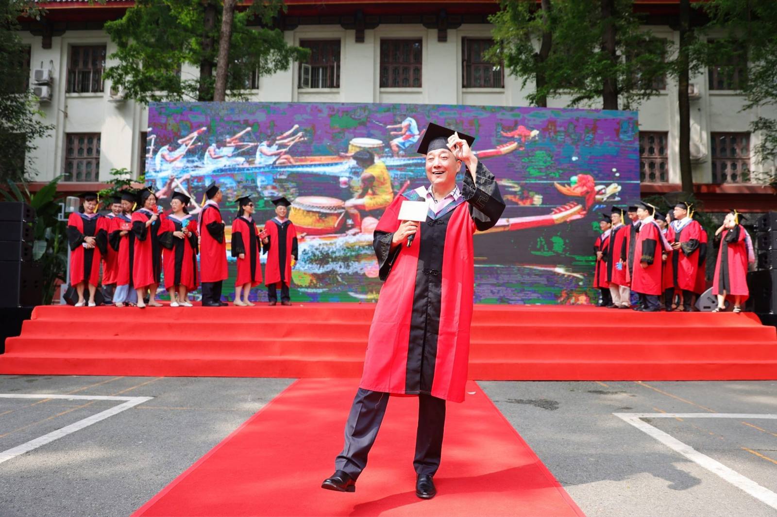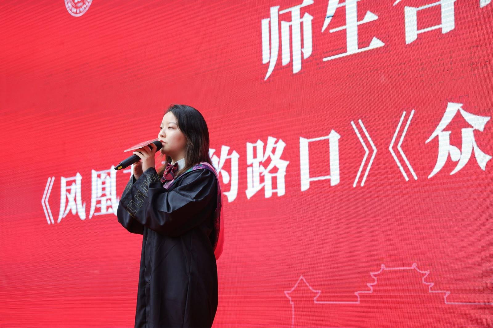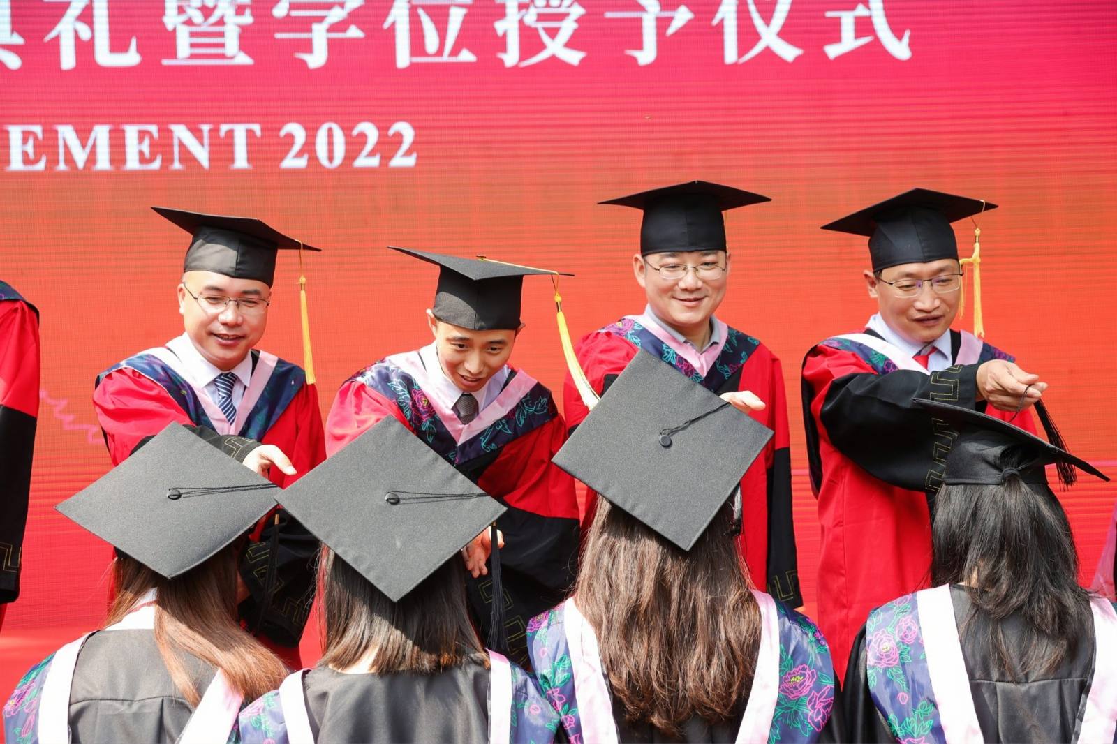 在师生联唱环节中,2022届本科毕业生高源同学领唱的《凤凰花开的路口》将毕业生的不舍之情展现得淋漓尽致,王谦教授与老师们合唱的《众人划桨开大船》表达了全体老师们齐心协力把同学们培养成卓越人才、师生们戮力同心把公司建设得更美好的心愿。最后,各专业老师依次为毕业生拨穗授位并合影留念。