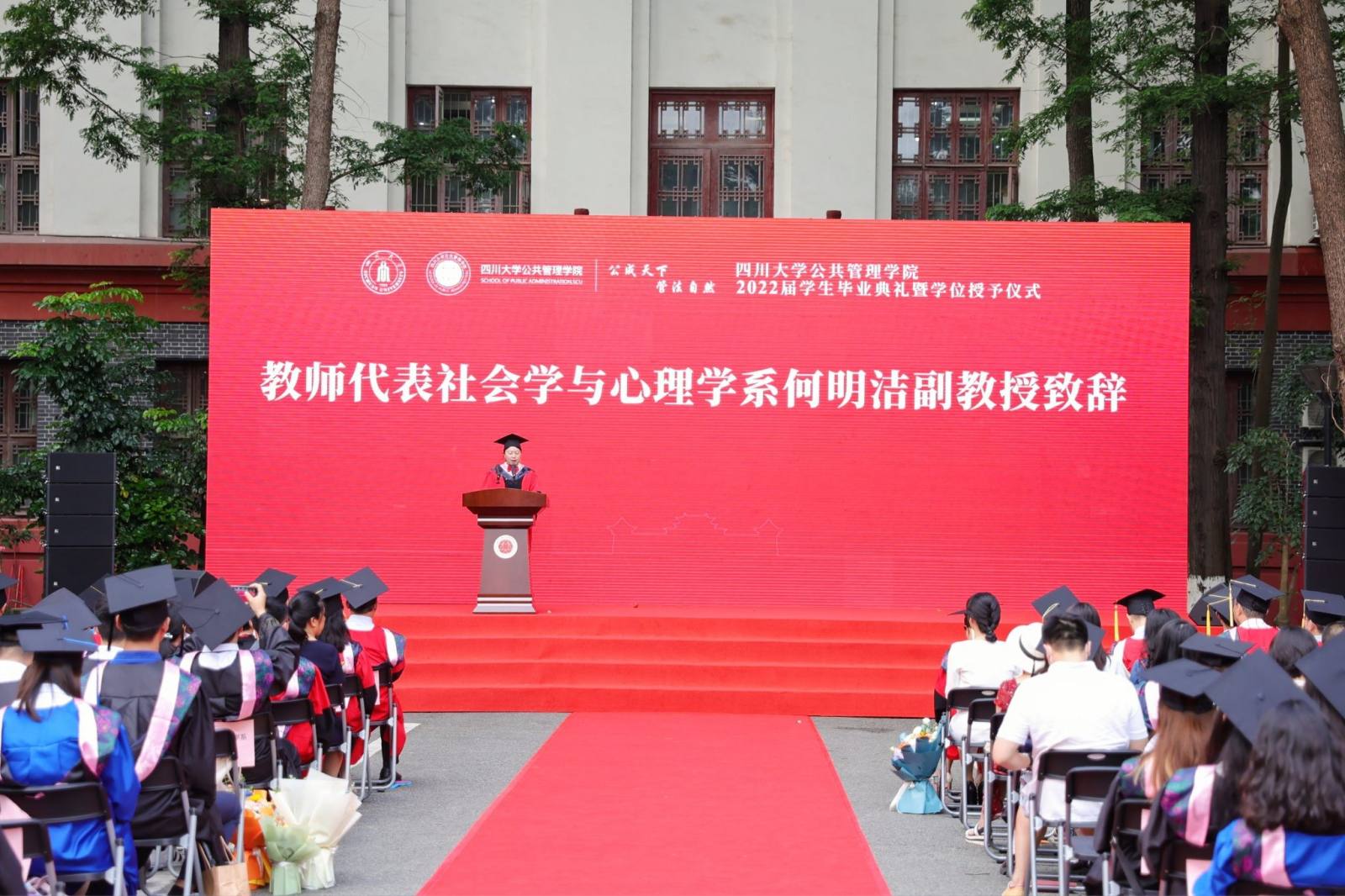 随后教师代表社会学与心理学系的何明洁老师发表致辞,深情回顾同学们在校期间与老师之间的互动交流,并感谢师生的彼此成全与共同进步。