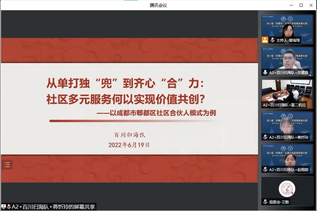 在行政管理系郭金云副教授的悉心指导和行政管理系各位老师的全力支持下,2019级行政管理专业本科生赵雨婷、苏健骉、扎央昭玛和2019级土地资源管理专业本科生蒋忻玲等四位同学组成的“百川归海队”,创作完成了高质量案例分析报告《从单打独“兜”到齐心“合”力:社区多元服务何以实现价值共创?——以成都市郫都区社区合伙人模式为例》,以复赛第一名的成绩进入决赛。在决赛中,该队在四个小时内完成作品《何以留住基层年轻公务员?——基于个人—组织匹配理论的研究》,并进行答辩展示,最终斩获一等奖,充分展现了公司学子强烈的家国情怀和扎实的学术素养。