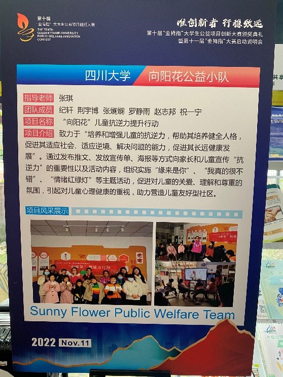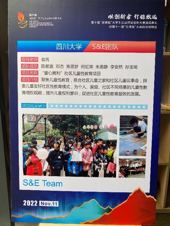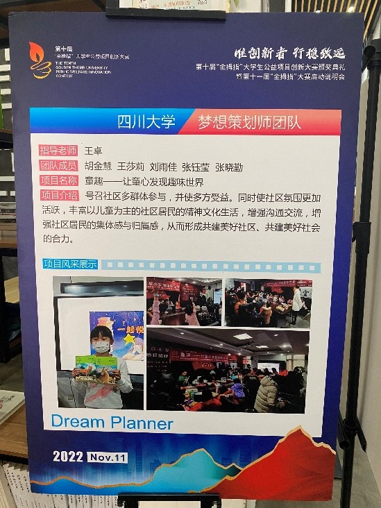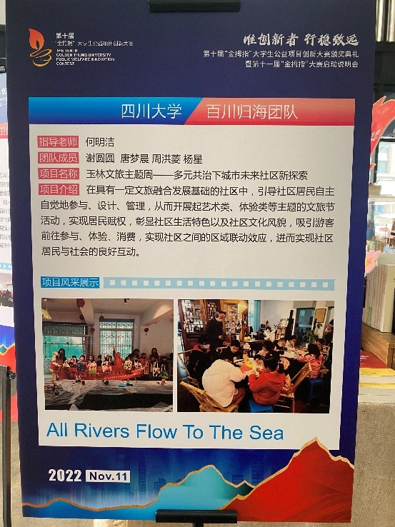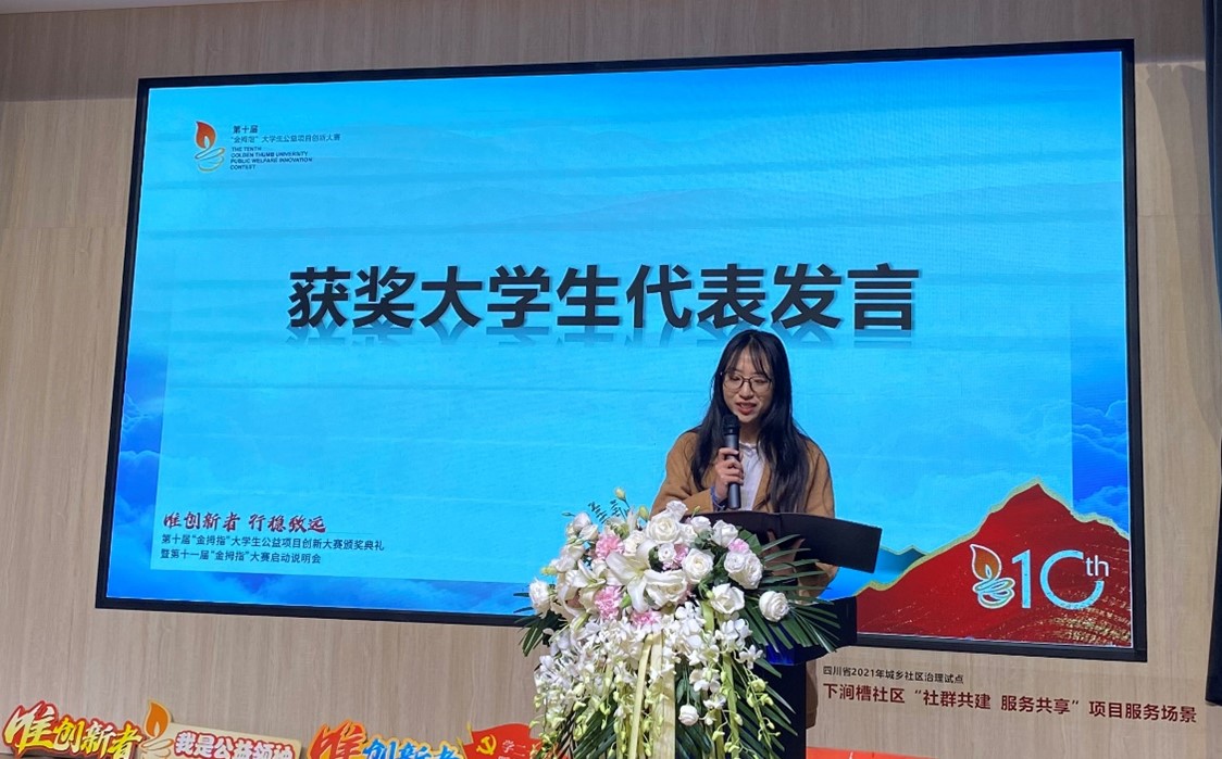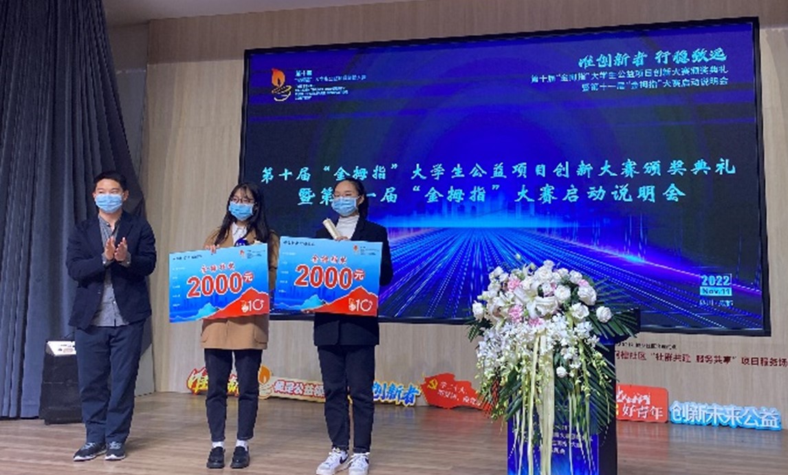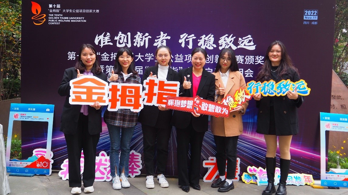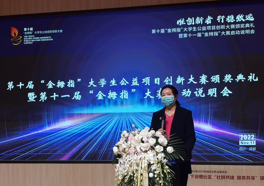 2022年11月10日下午,由成都市锦江区社会组织发展基金会举办的第十届“金拇指”老员工公益项目创新大赛颁奖典礼暨第十一届“金拇指”大赛启动说明会于成华区邻里月台顺利举行。团省委、锦基金、参赛高校师生代表出席活动。