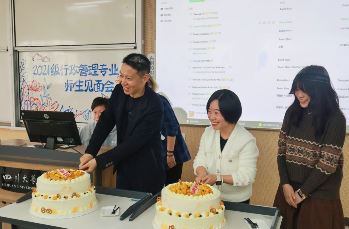 第二个环节——切蛋糕。班委将两个分别写有“公成天下,管法自然”和“行以明德,管以兴邦”的蛋糕推入活动现场,范逢春和李晓梅两位老师上台同切蛋糕,由班委成员分发,点燃欢乐的氛围。