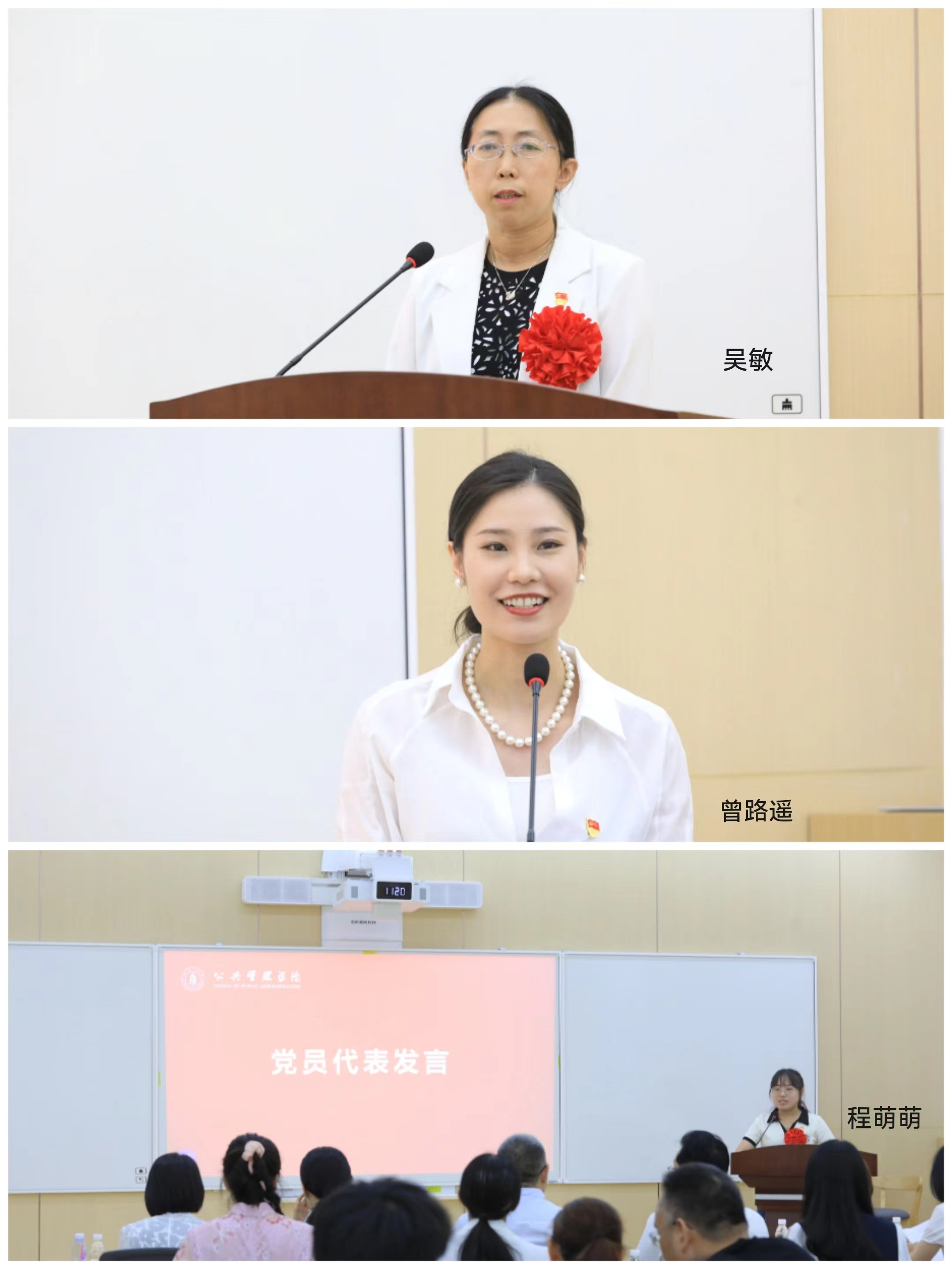先进基层党组织代表、教职工五支部书记吴敏同志,优秀党务工作者代表、本科三支部程萌萌同志,党龄整十年党员同志代表曾路遥同志分别发言。