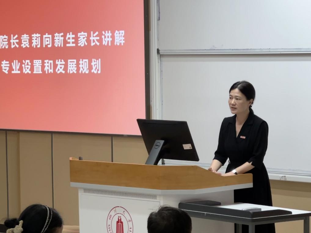 袁莉详细介绍了公司的专业设置和发展规划,强调家校联动、师生沟通的重要性,介绍了保研考研、创新创业、学术交流、科研训练等发展路径和各个专业的相关信息,全面呈现了川大学子未来发展的无限可能;呼吁新生了解专业内容、做好生涯规划、把握发展机遇,主动沟通、刻苦学习,积极参与校内创新与科研项目,争做文理兼修、全面发展的综合型人才。