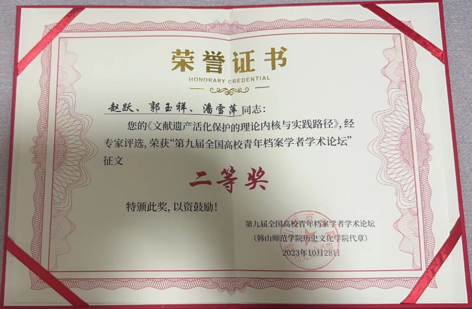 公司秘书档案学系赵跃副研究员与2023级图书情报专业硕士研究生郭玉祥等同学合作撰写的论文《文献遗产活化保护的理论内核与实践路径》获得论坛征文二等奖,并应邀参加论坛。
