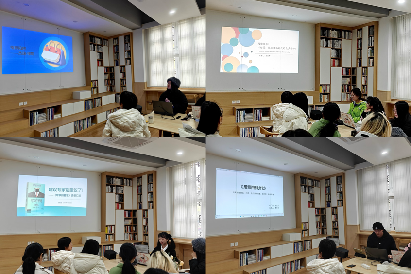 读书会上,图书馆学研究生闵芝菲解读了《指标陷阱——过度量化如何威胁当今的商业、社会和生活》一书,认为学习该书有助于正确对待和使用绩效指标,警示同学们切勿沉迷指标数据而忽略了经验与过程;图书情报学研究生王曼旌分享了自己对《专家的窘境:付费知识与意见市场》一书的阅读启示,并与大家讨论了AI时代的知识分工与社会伦理等问题;图书馆学研究生朱历娜为大家解读《标签:社交媒体时代的众声喧哗》一书,提出了具操作性的减少标签负面影响的方案,并围绕算法信息过滤等话题和同学们进行讨论。应用心理学研究生秦升东分享了《后真相时代》一书,他结合自身现实事例,让同学们认识到社会事件的多面性,勿被片面的真相蒙蔽了双眼。