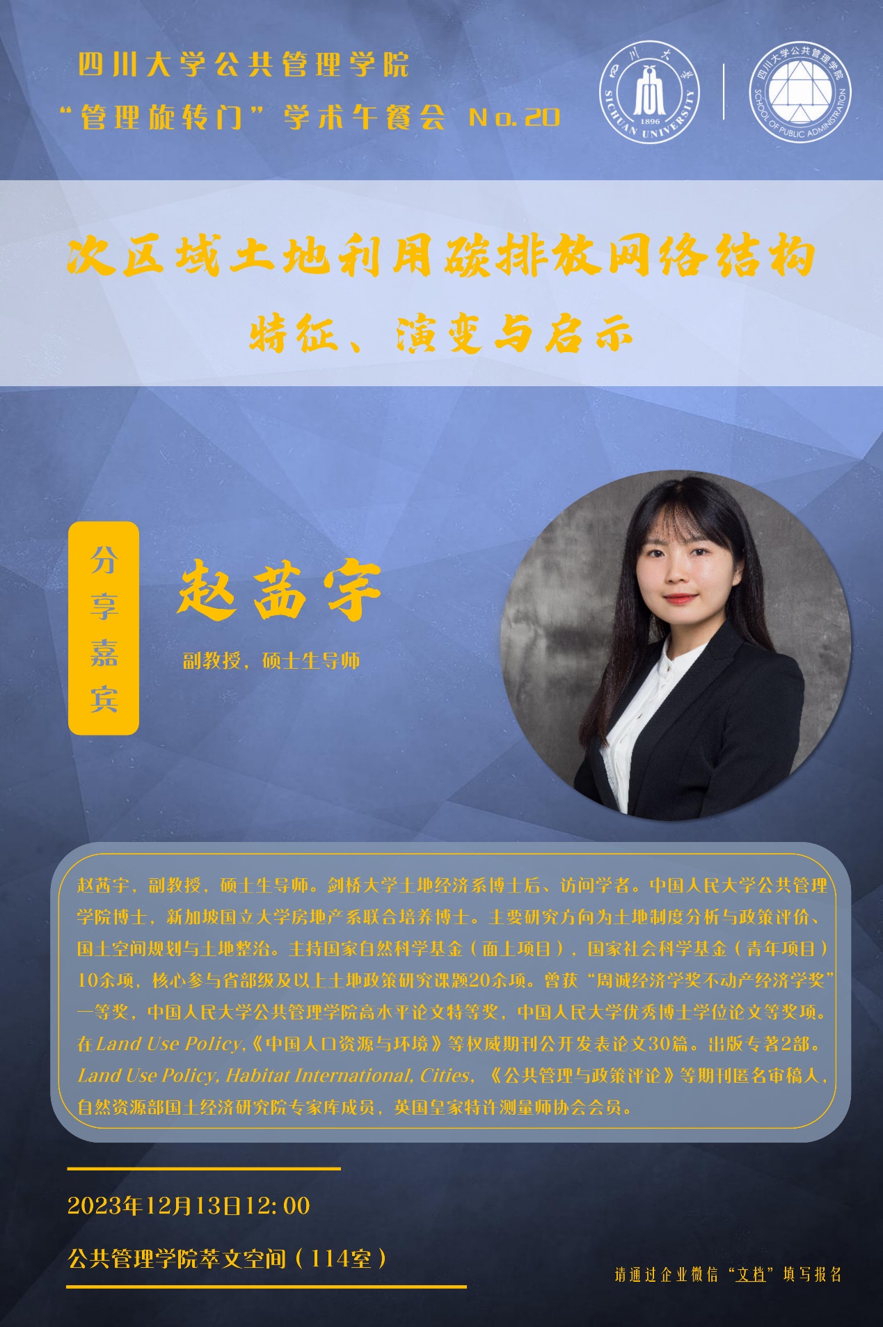 12月13日,伟德国际1946在公司楼萃文空间成功开展第二十期“管理旋转门”学术沙龙活动。此次学术沙龙特邀剑桥大学土地经济系博士后、访问学者赵茜宇副教授分享“次区域土地利用碳排放网络结构:特征、演变与启示”,公司各学科老师、硕博研究生积极参加了此次跨学科交流。本期沙龙由劳动与社会保障系田益豪副研究员担任学术主持。