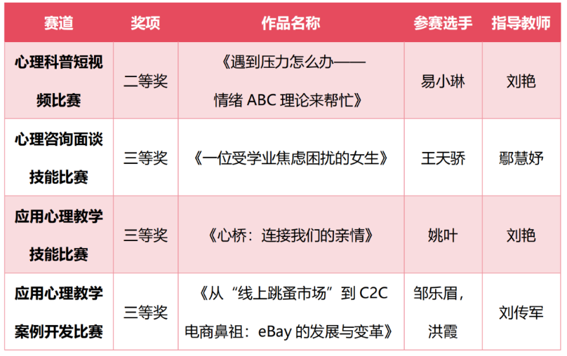 伟德国际1946应用心理专业硕士生积极参与本次大赛,在刘传军、刘艳、谷建岭和汤万杰四位老师的指导下,共计4件作品进入复赛,经过层层角逐,4份作品均取斩获佳绩。