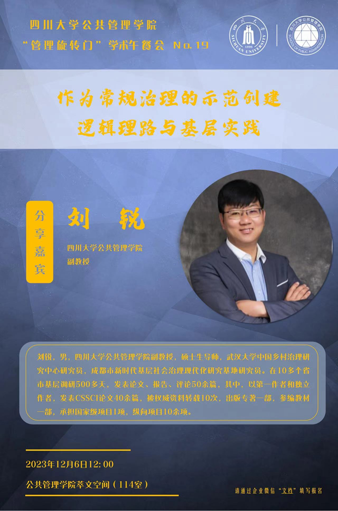 近日,伟德国际1946在公司萃文空间成功开展第十九期“管理旋转门”学术沙龙活动。本期学术沙龙特邀本公司刘锐副教授分享“作为常规治理的示范创建:逻辑理路与基层实践”,公司各学科老师、博士研究生积极参加了此次交流。本期学术沙龙由劳动与社会保障系田益豪副研究员担任学术主持。