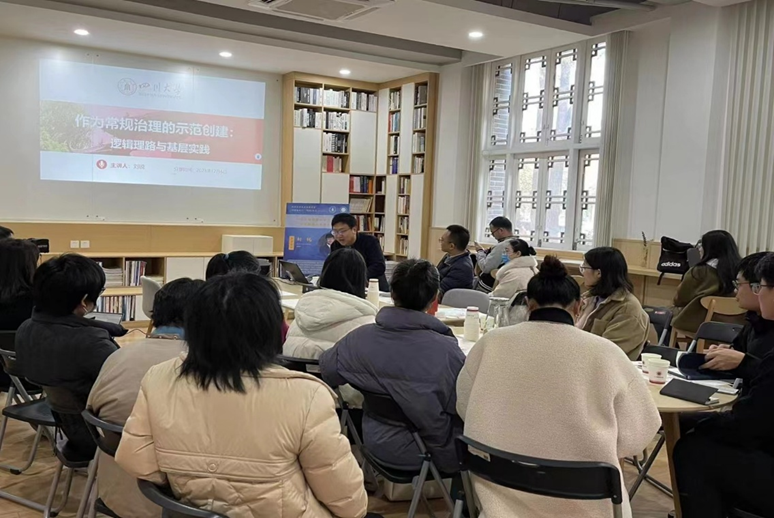 刘锐老师围绕“示范创建基层实践”主题展开分享,从“新时代的治理转向、群众生活治理的需要、基层治理能力不足”三方面切入,梳理新时代基层治理创新的体系特征和实践路径,分析典型地区示范创建过程及后果,就示范创建的要素多样性和联结复杂性进行说明。