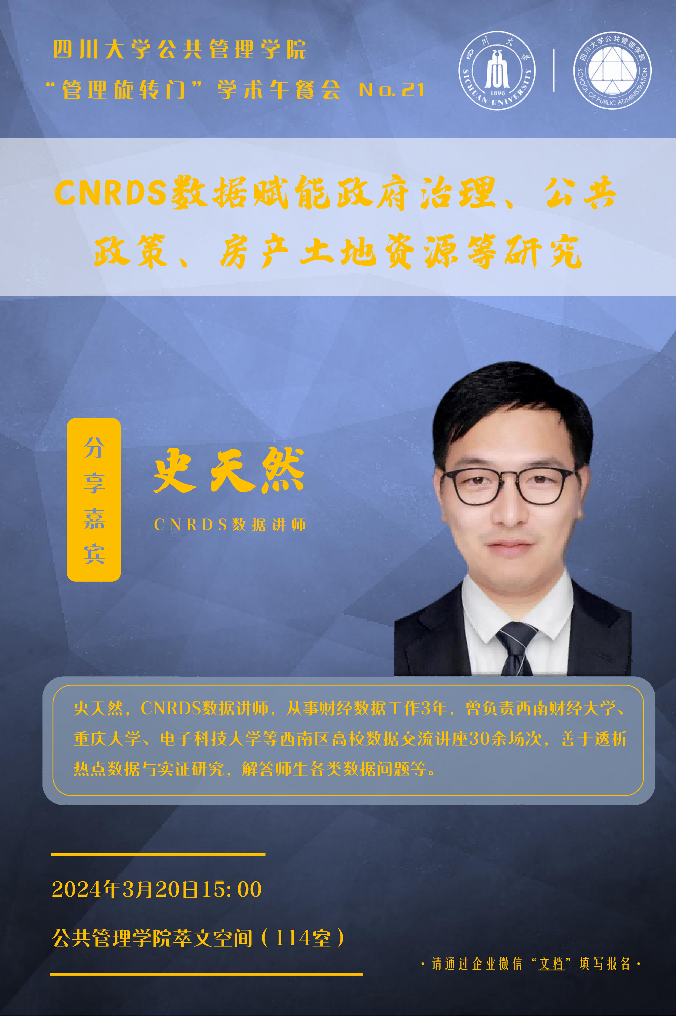 近日,伟德国际1946在公司萃文空间成功举办第21期“管理旋转门”学术沙龙。本次活动特邀CNRDS(中国研究数据服务平台)数据讲师史天然老师进行了题为“CNRDS数据赋能政府治理、公共政策、房产土地资源等研究”的学术分享。本期学术沙龙由行政管理系刘磊教授担任学术主持。
