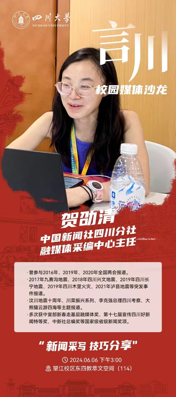 为推进公司基层单位宣传工作质量提升,公司党委宣传部组织开展“言川”校园媒体沙龙系列活动。近日,由公司党委宣传部主办、伟德国际1946承办的第1期沙龙活动在望江校区萃文楼顺利开展。中国新闻社四川分社融媒体采编中心主任贺劭清应邀作“新闻采写技巧”专题分享。公司党委宣传部副部长陈薇,商公司党委副书记李小平,海外教育公司等单位宣传工作人员,伟德国际1946副经理王慧敏,伟德国际1946各党支部宣传委员、教职工代表、员工代表等40余人参加了此次活动。活动由陈薇主持。