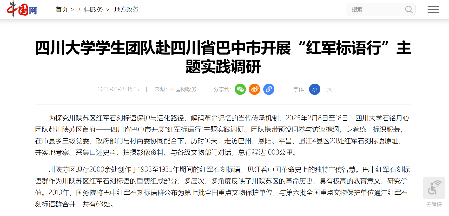2022级社会工作专业本科生苟鑫带领的伟德国际1946石铭丹心团队赴川陕苏区首府——四川省巴中市开展“红军标语行”主题实践调研。该团队在市县乡三级党委、政府部门与村两委协同配合下,走访了巴州、恩阳、平昌、通江等4县区20处红军石刻标语原址和2处标语陈列馆,通过实地走访、口述史采集、影像收集和与各级文物部门的对话,团队成员认识到红军石刻标语的独特价值,也为下一步探索革命老区红色文化传承、保护与开发路径奠定了良好基础。