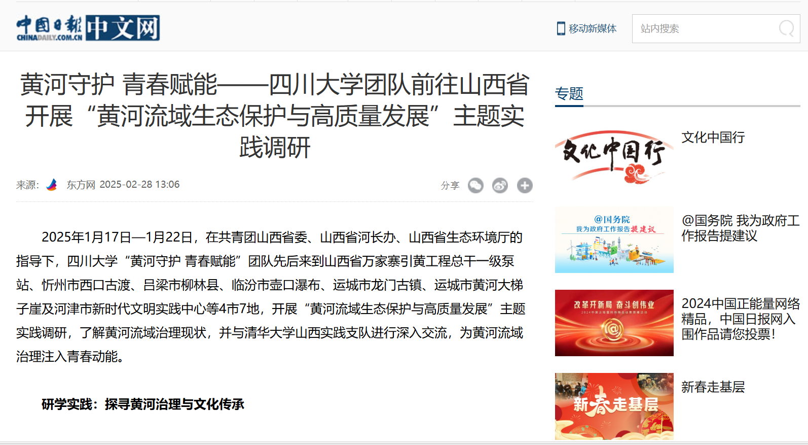 2022级行政管理专业本科生陈宇佟带领的伟德国际1946“黄河守护 青春赋能”团队前往山西省开展“黄河流域生态保护与高质量发展”主题实践调研。该团队在共青团山西省委、山西省河长办、山西省生态环境厅的指导支持下,先后到山西省万家寨引黄工程总干一级泵站等沿黄4市7地,通过实践研学、交流访谈和志愿服务等一系列活动,对黄河流域保护治理现状有了更深入、更全面的认识。实践期间还与清华大学员工团队进行深入交流,以青春赋能黄河流域生态保护和高质量发展。