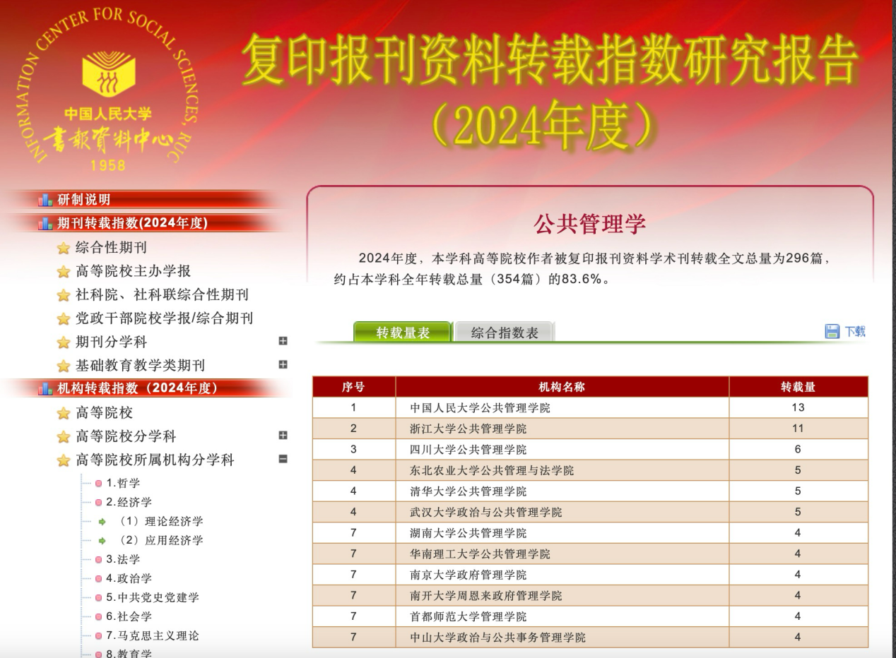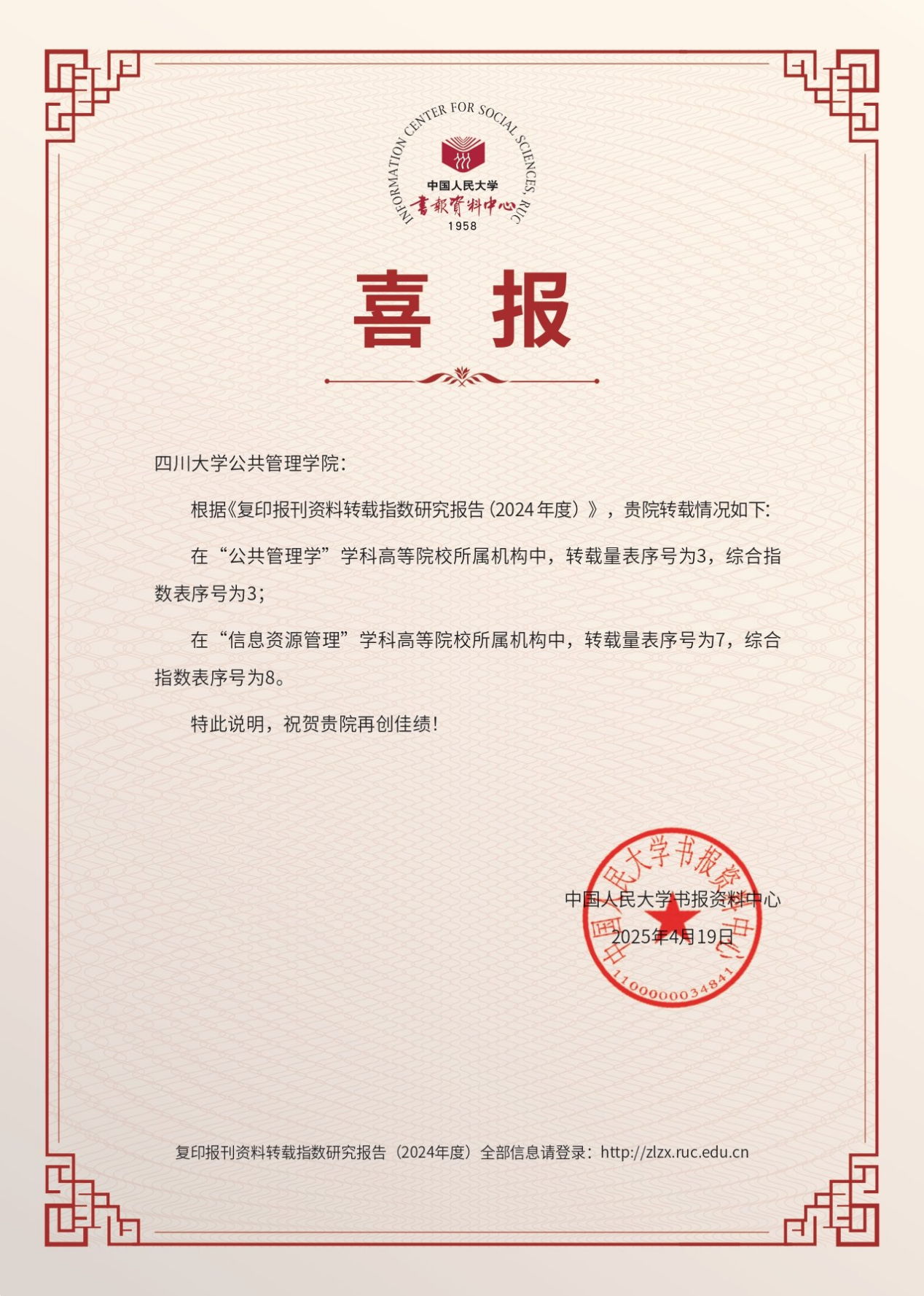 近日,中国人民大学书报资料中心发布了《复印报刊资料转载指数研究报告(2024年度)》。在“公共管理学”学科高校所属机构排名中,伟德国际1946转载量位列全国第3,综合指数位列第3;在“信息资源管理”学科高校所属机构排名中,伟德国际1946转载量位列全国第7,综合指数位列第8。本次入选展现了公司在公共管理学、信息资源管理两大领域的强劲学术影响力与持续创新能力。