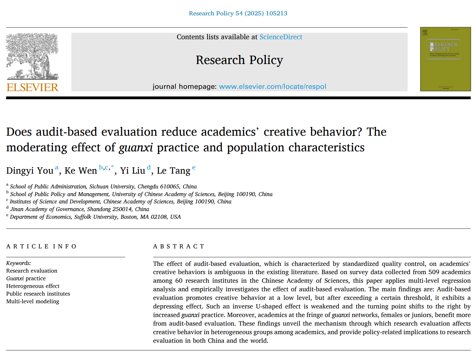 近日,公司行政管理系游玎怡特聘副研究员作为第一作者,在科技管理领域国际顶级学术期刊《Research Policy》发表题为《Does audit-based evaluation reduce academics' creative behavior? The moderating effect of guanxi practice and population characteristics》的研究论文。‌《Research Policy‌》主要刊发科研政策、技术创新、环境等多学科方面的研究论文,致力于分析和理解经济、政策、管理、环境等方面的问题,‌以其跨学科研究特色和高学术影响力著称,在创新研究领域具有标杆地位。‌这是公司首次在该期刊发表研究成果。
