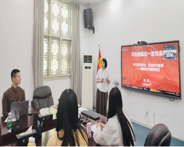 李岚以“牢记党员身份,勇担时代使命”为题,结合八项规定高校违纪违法警示案例,为毕业生党员讲授了专题党课。她围绕“筑牢思想防线”、“牢记初心使命”、“践行根本宗旨”、“主动担当作为”四个方面,教育博士生党员在未来的工作中,要时刻做到在党言党、在党忧党、在党为党。希望大家在新征程上心怀青衿之志、行以弘毅致远,真正成为新时代的担当者、同行者、廉洁者和奋斗者。