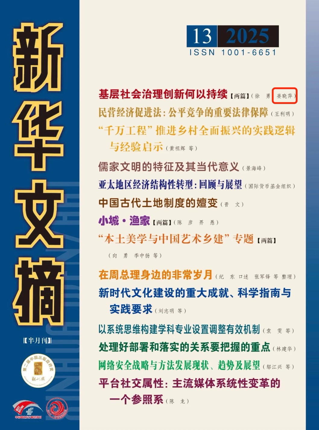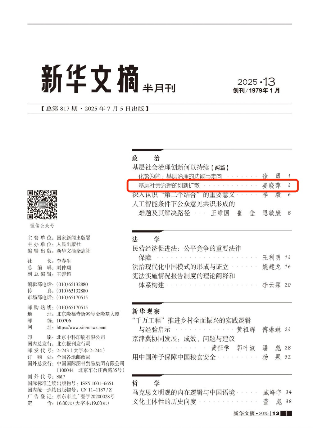 7月出版的《新华文摘》(2025年第13期)转载了公司姜晓萍教授的论文《基层社会治理的创新扩散》。
