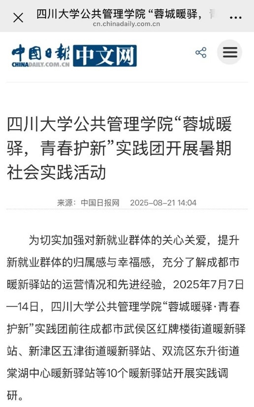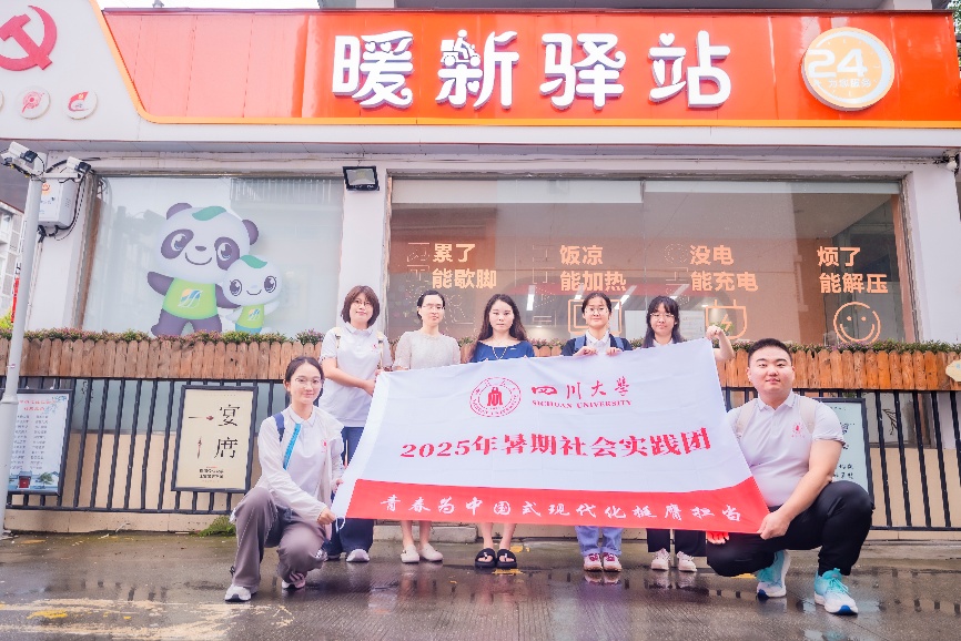 校社互动,共绘暖“新”蓝图。通过此次实践调研,实践团对成都市暖新驿站在新就业群体权益保障方面的作用有了更加全面的把握、更加深刻的认识。在实践过程中,团队成员将“以专业所长回应民生所盼”,实现“知”与“行”的融合,真正在服务城市建设、传递社会关怀的实践中践行“把论文写在祖国大地上”的治学理念。