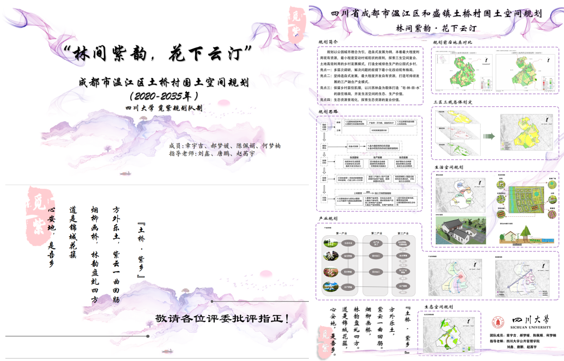 由公司土地资源与房地产管理系教师刘鑫、唐鹏、赵茜宇担任指导老师, 2017级土地管理专业本科生章宇吉、郝梦媛、陈佩娟、何梦楠四位同学组成的“觅紫规划队”完成的规划作品《“林间紫韵,花下云汀”——四川省成都市温江区和盛镇土桥村国土空间规划》,在三十支决赛作品中脱颖而出,获得决赛二等奖。同时,伟德国际1946获得了本次大赛的优秀组织单位奖。