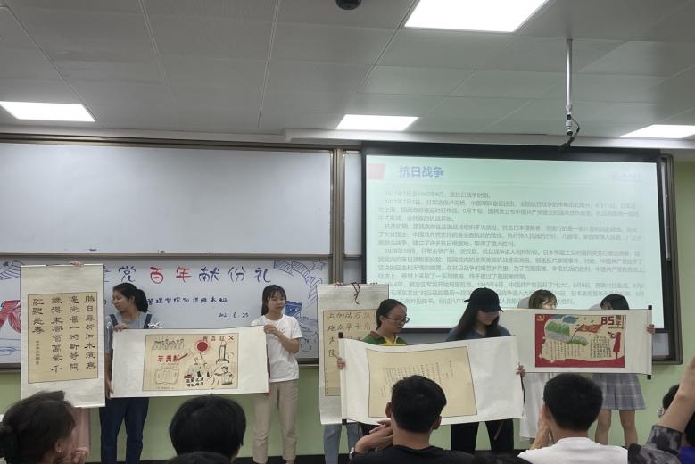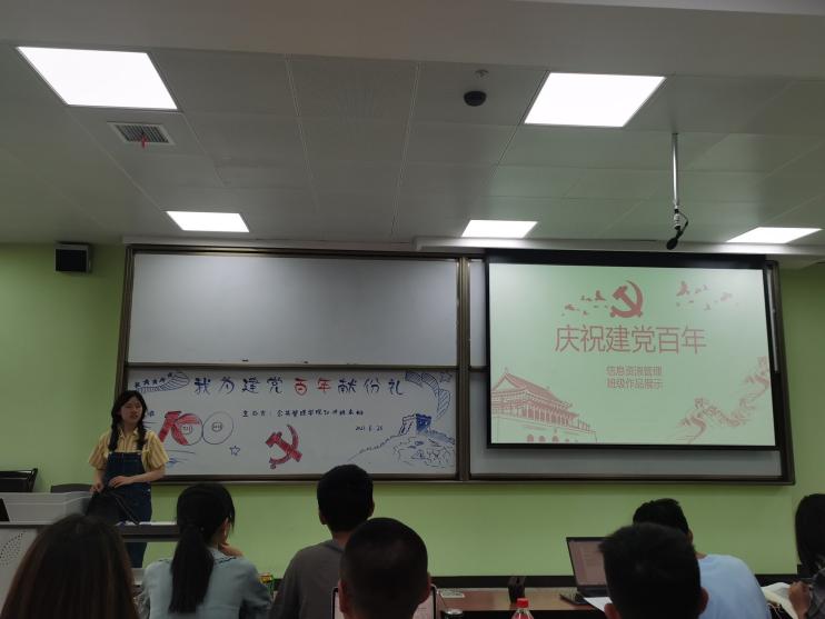 信管班的同学们则将目光转向那建党百年中的英雄人物,介绍了邓小平、江姐的生平事迹,伟大的故事是永远听不厌的,生动的事迹每一次都能带给我们新的体会与感动。同时,信管班的同学还展示了同学们共同创作的绘画和诗篇,让那国旗上的五角星带着革命的光辉照亮嘉兴南湖的游船、让那鲜艳的红旗飘荡在山里、海边、每个人的心里。