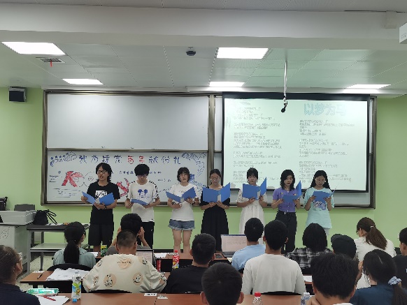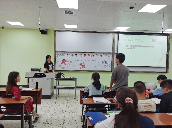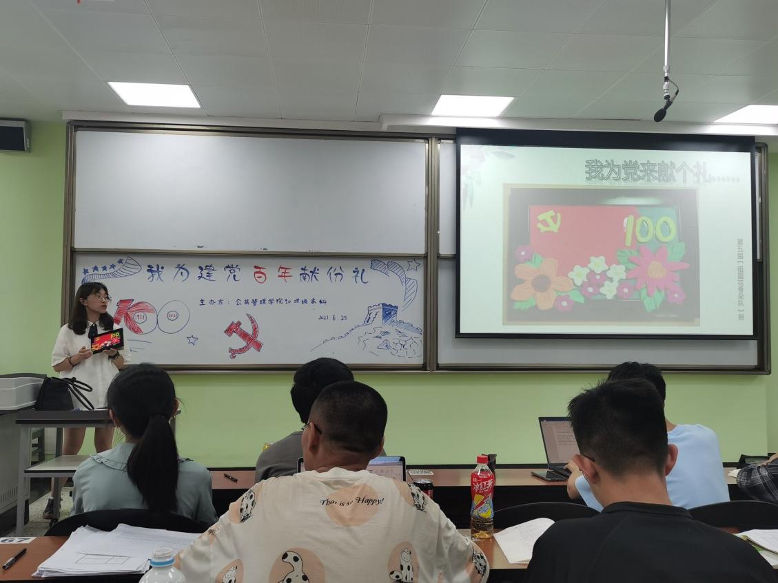 最后出场的是公管大类一班的同学们,他们回归淳朴,采取了讲述党史故事的方法,将自己的浓厚感情寄托在一张又一张精心准备的当时幻灯片中。历史仿佛在这一刻重现,那建立新中国、实现中华民族伟大复兴的理想穿越了千百年,伴随着这演讲声,又一次回荡在教室中,激励着我们每位同学奋勇向前。