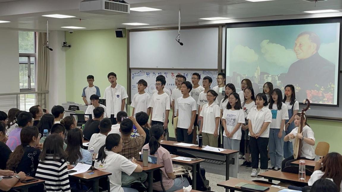大类二班的同学们的节目更是让人耳目一新,最开始的诗朗诵中,同学们用庄严的神情抒发着自己对共产党历史的缅怀之情,更是用饱满的热情表现了对未来祖国、未来党的更好建设的期待。伴随着悠扬的背景音乐,同学们携着一幅幅精美的画作向我们走来。从最开始的中国共产党于画舫上成立,到伟大的二万五千里长征,最后再到抗日战争解放战争,同学们把共产党百年伟大征程呈现在了书画作品之中。最后,二班的同学们还采用了大合唱的方式,现场奏乐合唱《春天的故事》。和谐的音律、振奋人心的歌词、充满感情的演唱,一下将现场氛围带入高潮,带到了1978年,“那是一个春天,有一位老人在南海边画了一个圈。”在中国共产党的带领下,我们迈出了改革开放的伟大步伐,中国人民更是从站起来走向了富起来。