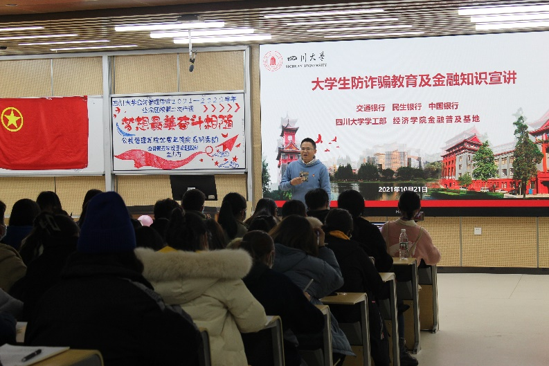 来自交通银行的王游明行长为同学们带来了“老员工防诈骗教育及金融知识宣讲”。他从“你可能遇到的坑”“防范电信网络诈骗”以及“老员工如何理性消费及珍视个人信用”三个方面展开,讲述了校园贷特点、巨款债务如何形成、网络新型骗局“注销校园贷”等内容。强调同学们要牢记十个“凡是”、“五要五不要”以防范电信诈骗,介绍了群体示范效应、攀比从众、明显广告刺激等消费现状,告诉同学们要做到理性消费,分享了自身经历使同学们对个人征信有了新的理解。