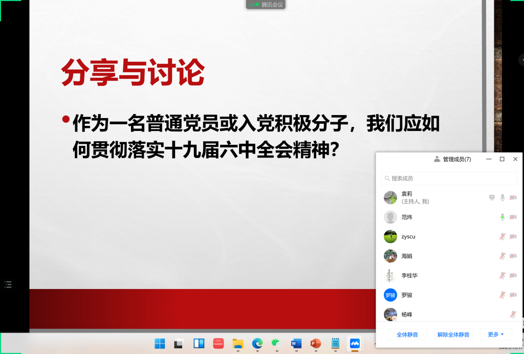 2021年11月17日,教工六支部全体党员和入党积极分子通过腾讯会议,进行了主题党日的学习,对党的十九届六中全会精神进行了认真学习和讨论。