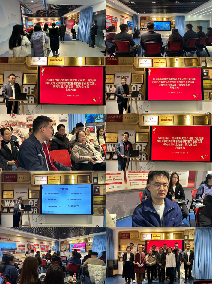 为扎实推进一流党支部、一流党员队伍建设,着力构建“一融双高”工作体系,12月20日上午,公司秘书档案学系党支部、研究生第六党支部、研究生第九党支部十余位同志赴四川电力设计咨询有限公司(四川院)同其第二党支部开展共建交流活动。