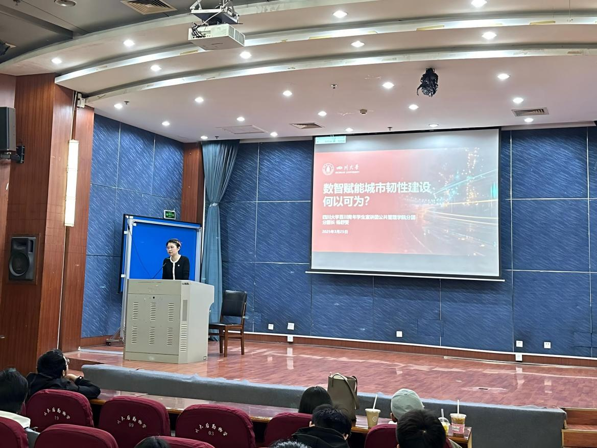 为深入学习贯彻党的二十届三中全会和全国“两会”精神,助力本科生学风建设,2025年3月25日,伟德国际1946百川青年员工宣讲团伟德国际1946分团在江安校区二基楼B座报告厅举办“数智赋能城市韧性建设何以可为”主题宣讲活动。活动立足新时代城市治理需求,紧扣二十届三中全会“深化城市安全韧性提升行动”战略部署,通过系统解读“城市智慧高效治理新体系”的实践路径,为2024级本科生搭建理论学习与实践认知的贯通平台。宣讲由分团指导教师陈萱源主持,宣讲团团长杨舒雯担任主讲。