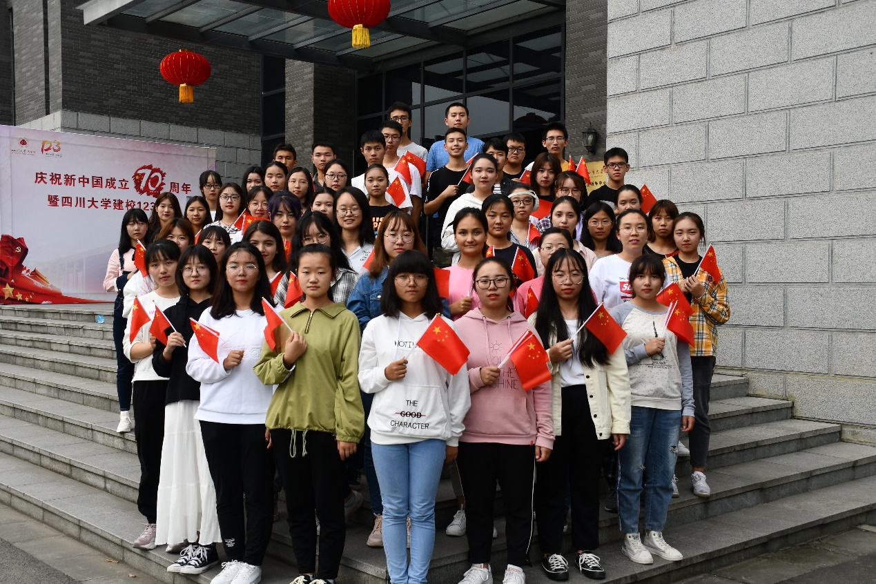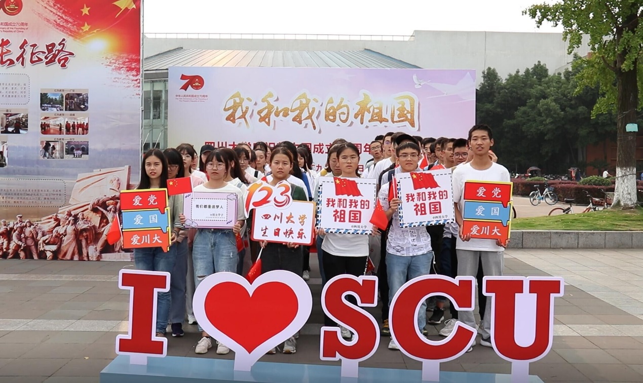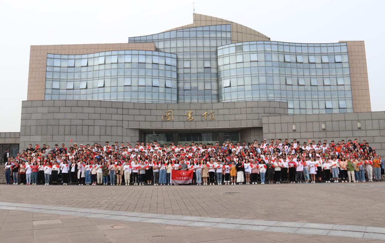 同学们在图书馆前祝福祖国母亲生日快乐